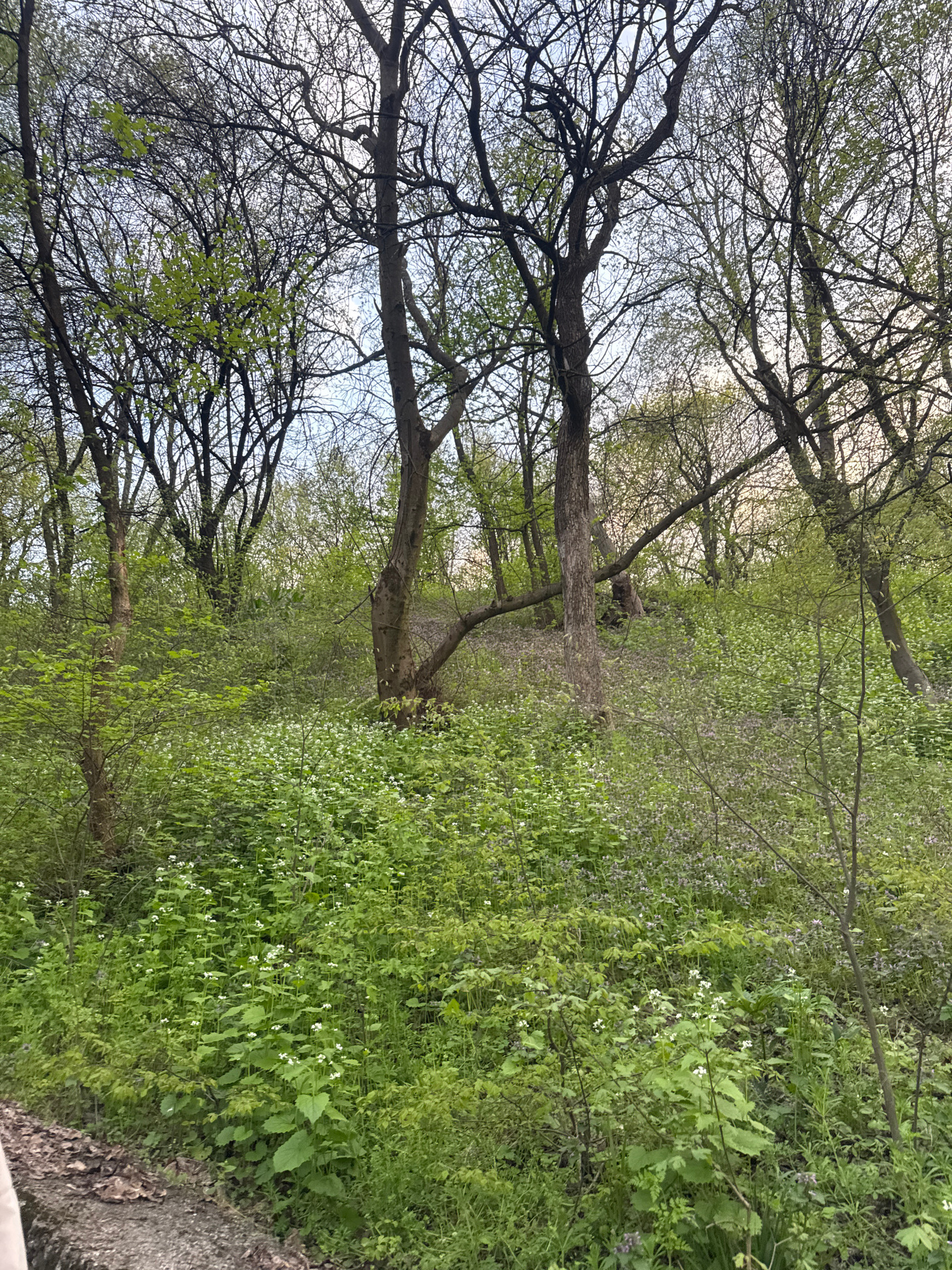 The image depicts a path through a wooded area, likely in early spring. Trees with bare branches overhead are starting to show new leaves. The ground cover is dense with green foliage and small white…read more
