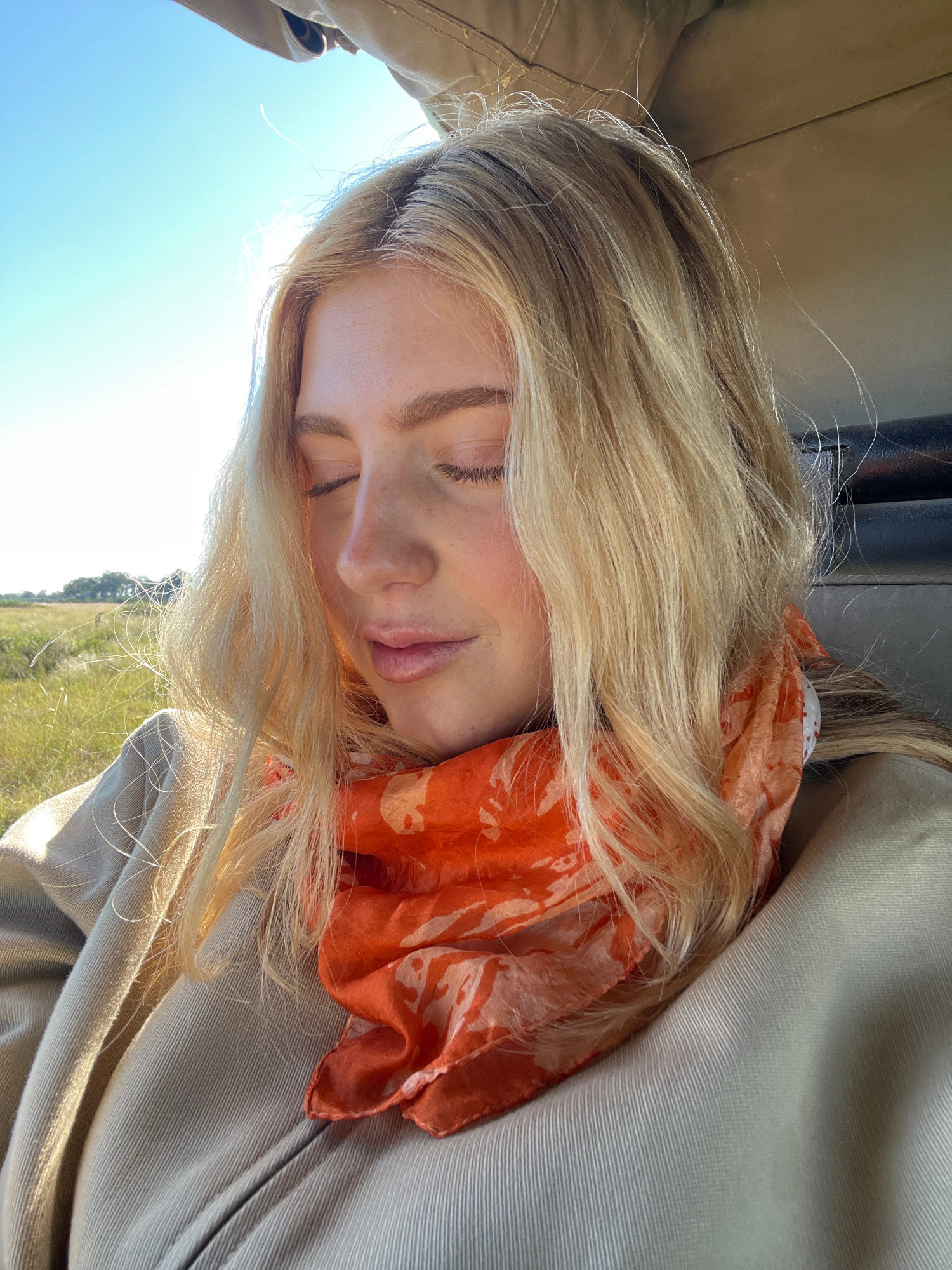A blonde woman with an orange scarf is resting in a vehicle. The location is outdoors near a grassy field. The sky is visible. The specific location within Nwanaeanoka, Botswana, cannot be determined…read more