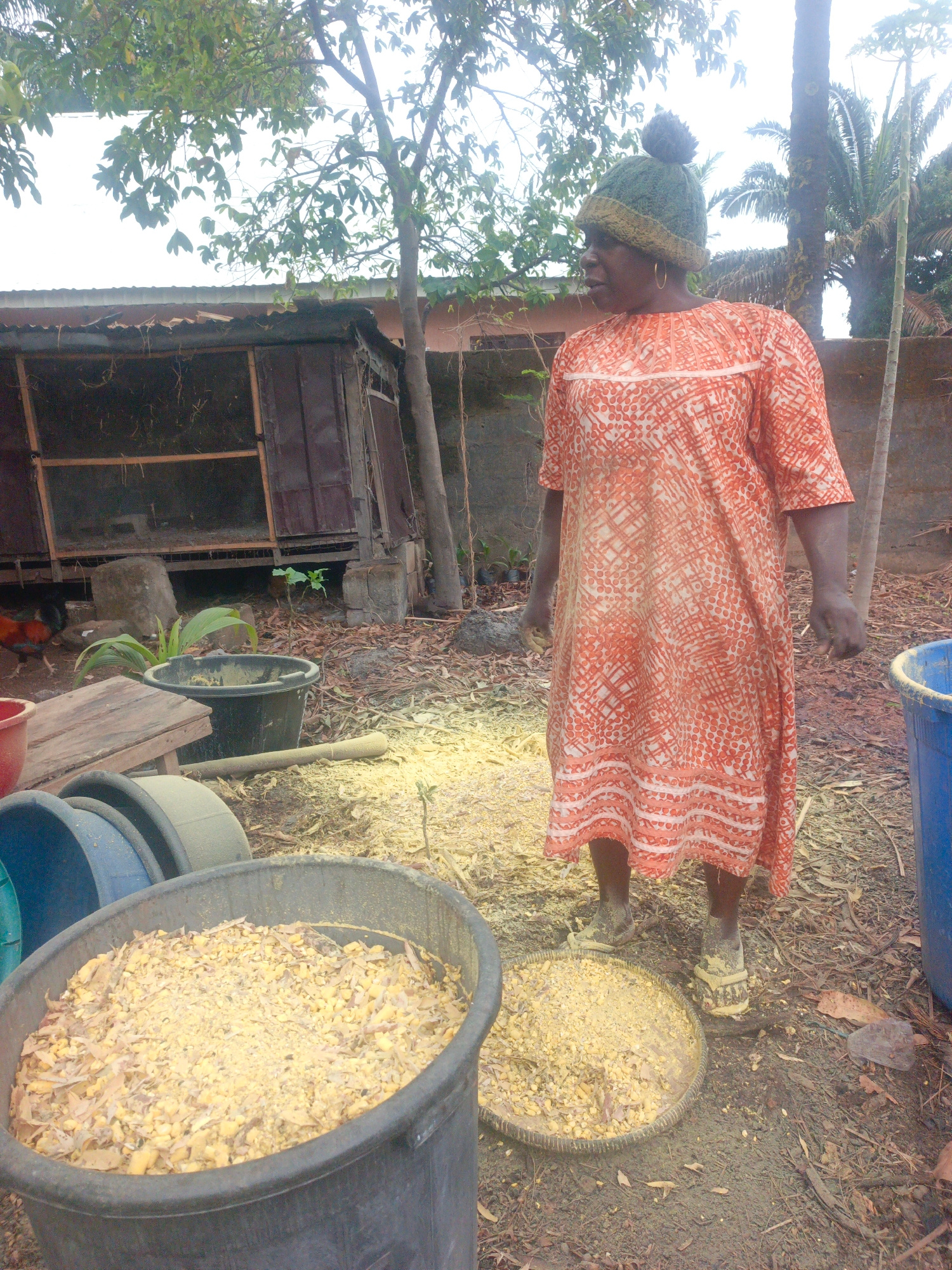 A woman wearing an orange patterned dress and a green knit hat with a pompom stands in a yard in Akwanga, Nigeria. She is surrounded by buckets and trays filled with what appears to be animal feed. A…read more