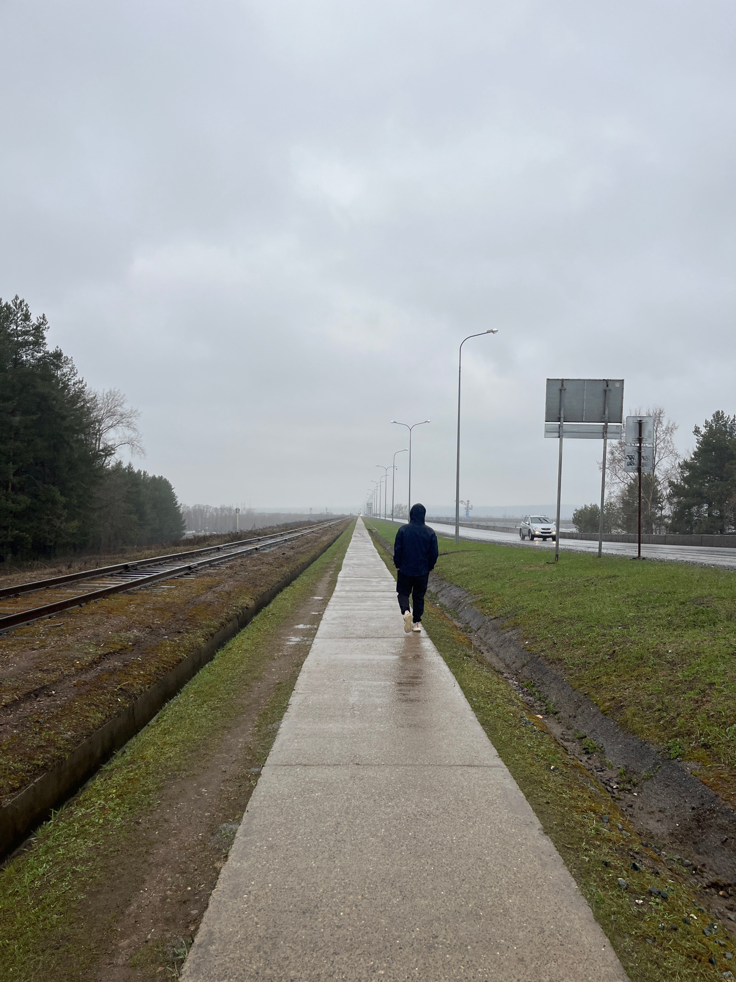 A solitary figure walks along a wet concrete sidewalk next to a railway line on an overcast day in Chaikovsky, Russia. The image, captured with a slightly askew horizon, depicts a wide, open landscape…read more