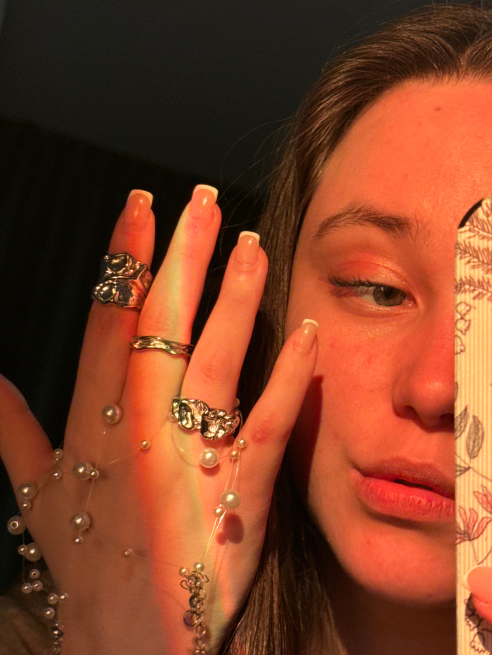 The image presents a close-up, warm-toned portrait of a female individual, primarily focusing on her left hand and the right side of her face. A strong, reddish-orange light source illuminates the sce…read more