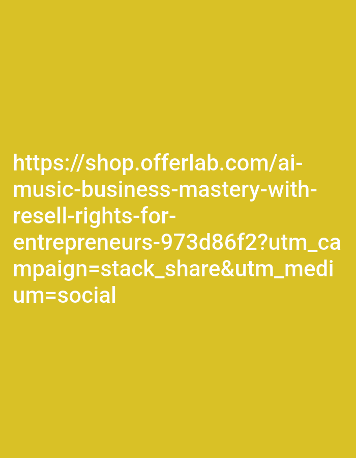 The image is a solid yellow background with a white URL printed on it. The URL is "https://shop.offerlab.com/ai-music-business-mastery-with-resell-rights-for-entrepreneurs-973d86f2?utm_campaign=stack_…read more