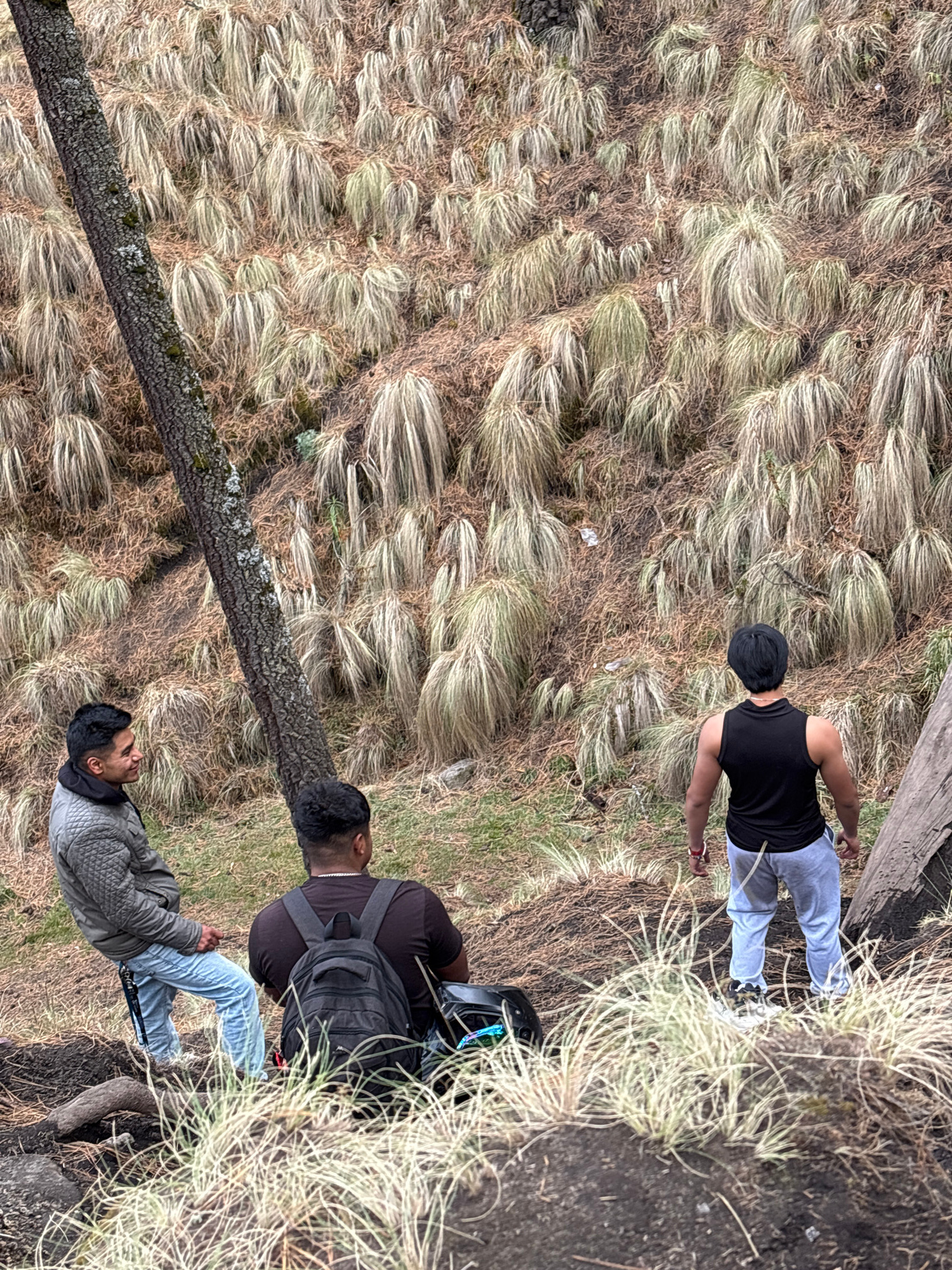Here is a forensic description of the image: The image shows an outdoor scene, likely in a mountainous region, with three individuals positioned near a tree trunk. The ground is covered in dense, str…read more