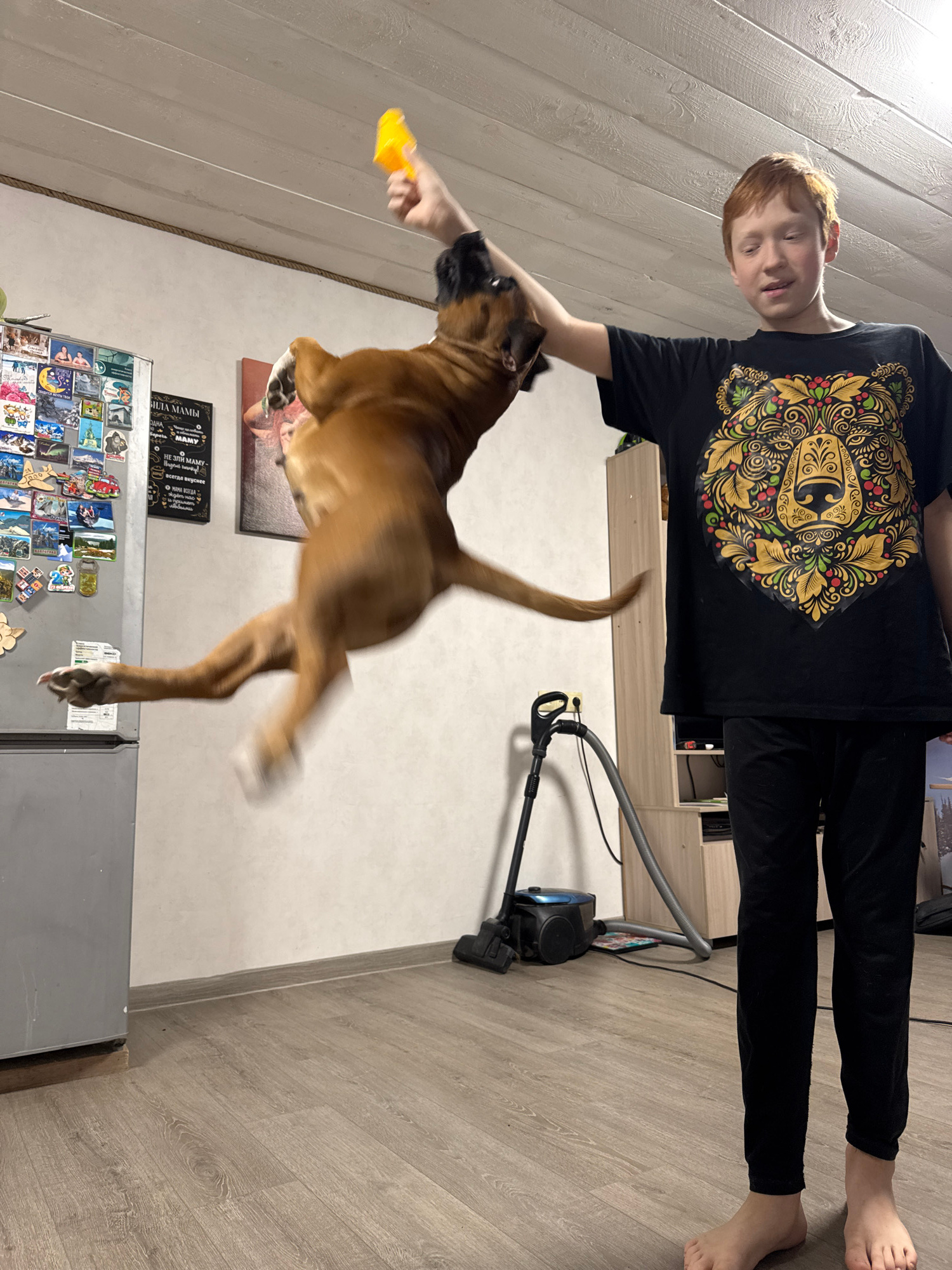 A boy in a black t-shirt with a graphic design on the front is holding a yellow toy, teasing a boxer dog that is mid-jump in what appears to be a kitchen. The boy is wearing black pants and is barefoo…read more
