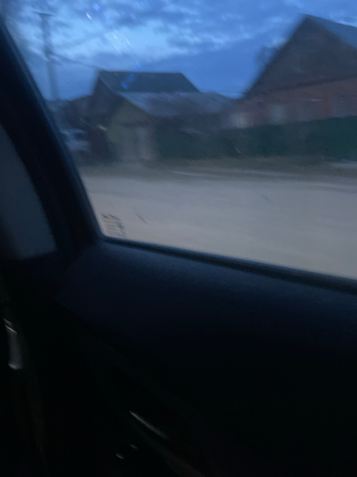 The image appears to be taken from inside a vehicle, looking out the side window. The view is partially obstructed by the car's frame. Outside the window, there is a street or road, and a building is…read more