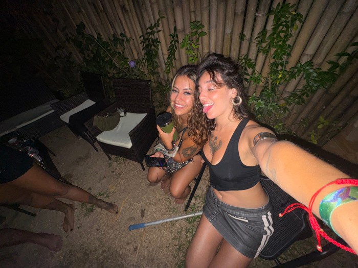 The image displays an outdoor, nighttime scene situated in Moo 4, Thailand, featuring three individuals. In the immediate foreground, a woman with dark hair, wearing a black tank top and dark mini-ski…read more