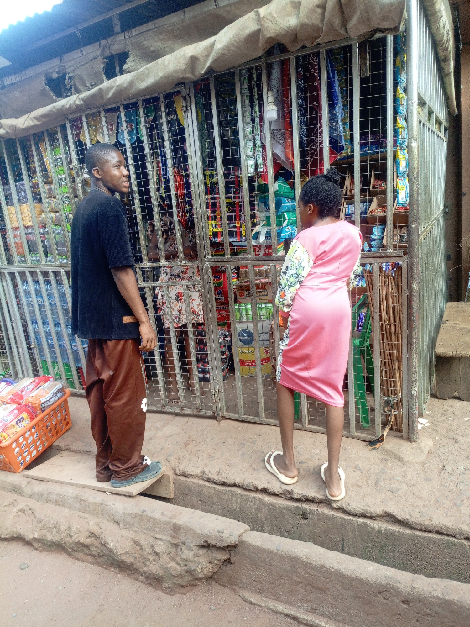 An outdoor scene in Onitsha, Nigeria, shows two individuals interacting with a small, informal shop or kiosk. The shop is secured by a tall, gray metal grid gate, behind which shelves are packed with…read more