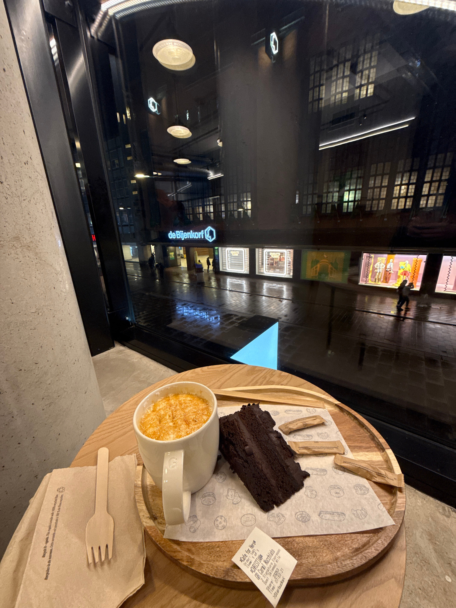 Here is a detailed description of the image: **Scene:** A cafe setting, likely inside or adjacent to a "de Bijenkorf" department store. **Location:** Judging by the order slip and storefront reflect…read more