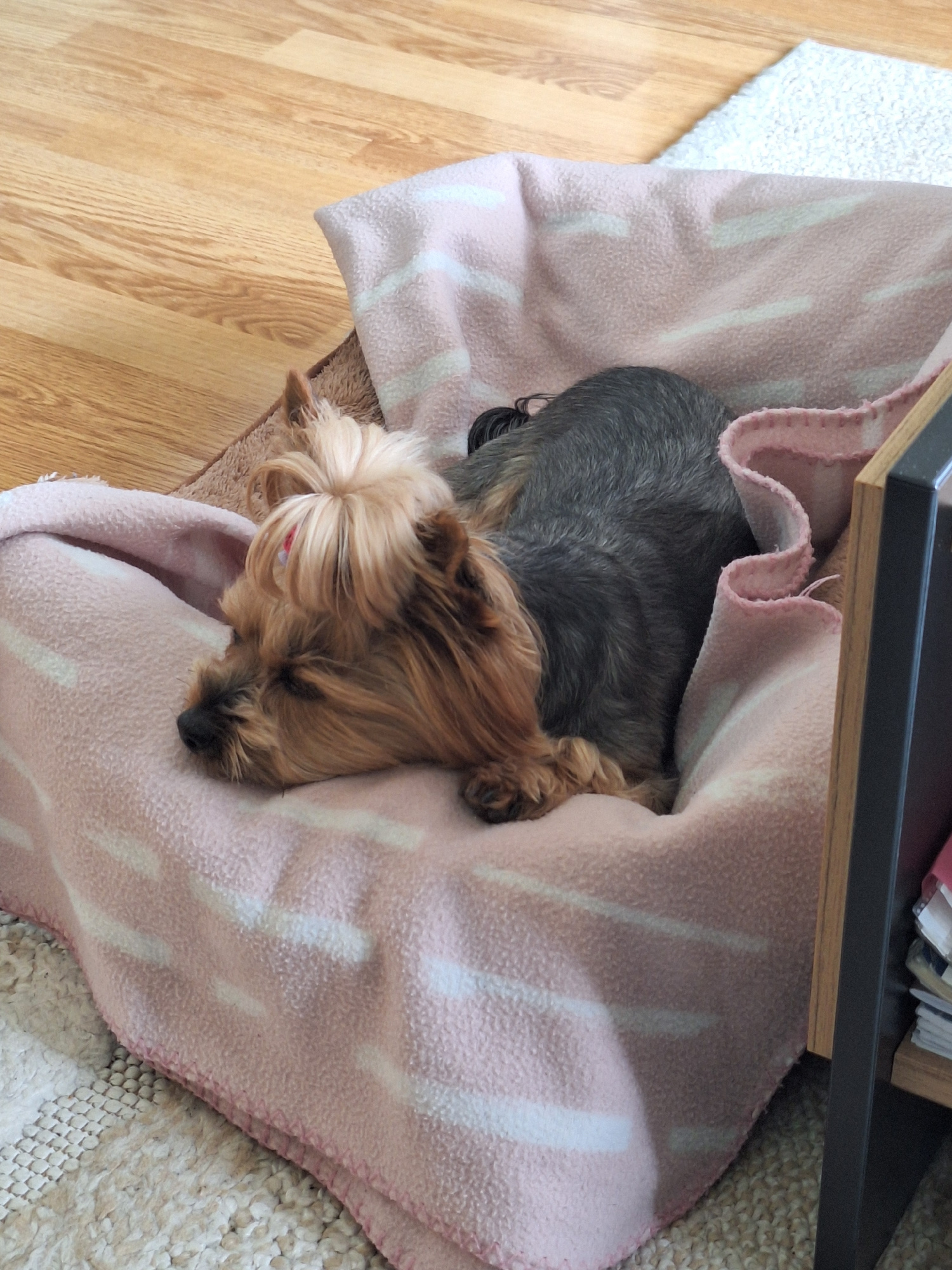 This indoor, eye-level shot captures two small dogs, likely Yorkshire Terriers, nestled cozily under a pink blanket. The prominent dog in the foreground is light brown/tan with long, groomed fur, itsβ¦read more