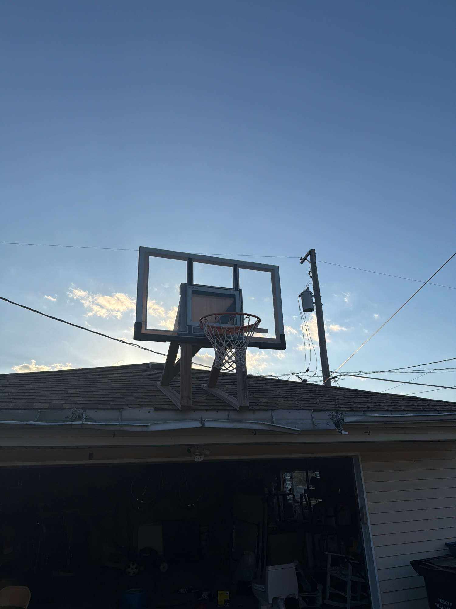 This image, taken in Norridge, United States of America, depicts an outdoor scene, rotated 90 degrees counter-clockwise. The left side of the frame is dominated by a clear, bright blue sky with scatte…read more