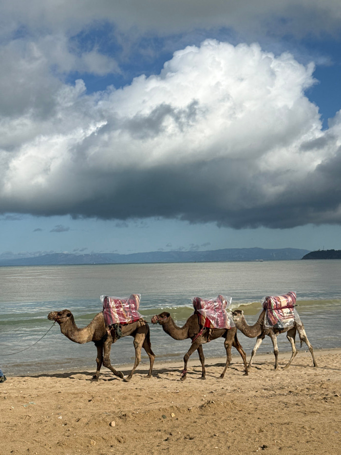 The image depicts three dromedary camels walking left-to-right along a sandy beach in Tangier, Morocco. The camels are equipped with red and patterned saddles, each covered with clear plastic sheeting…read more