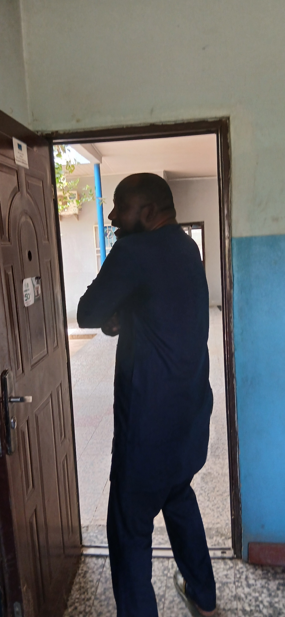 A man is standing in a doorway. He has dark skin, a shaved head, and is wearing dark blue clothing. He is looking down at something near the bottom of the door. The door is brown. The doorway leads to…read more