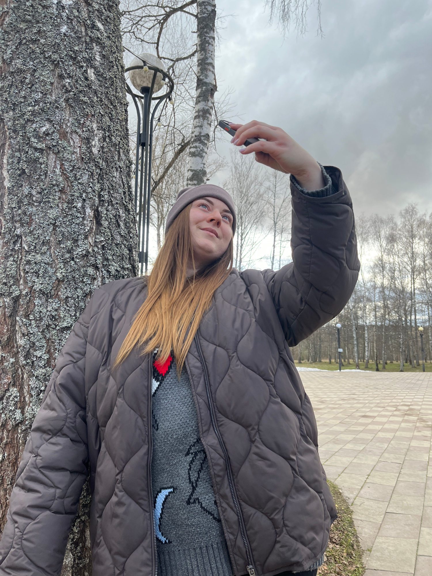 A young woman is holding a small black object, possibly a vape or lighter, near a tree in what appears to be a park or outdoor recreational area. She is wearing a gray knit hat, a brown quilted jacket…read more