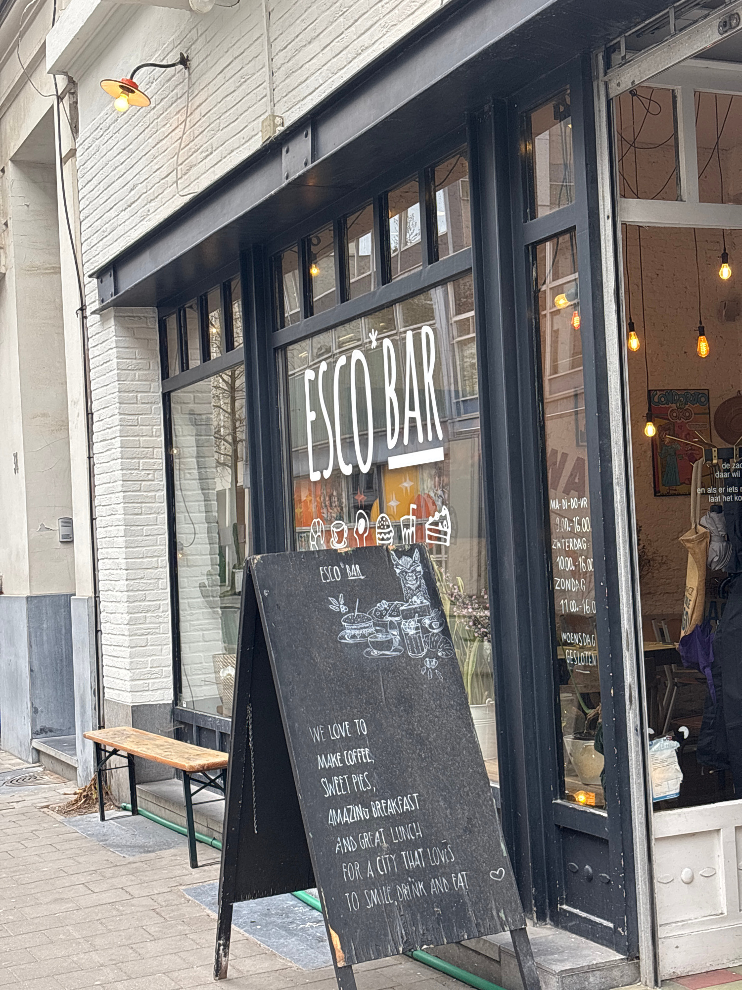 The image shows the exterior of "Escobar," a cafe or bar. The storefront features a glass window with the name "ESCOBAR" printed in reverse. An A-frame chalkboard sign stands in front, advertising cof…read more