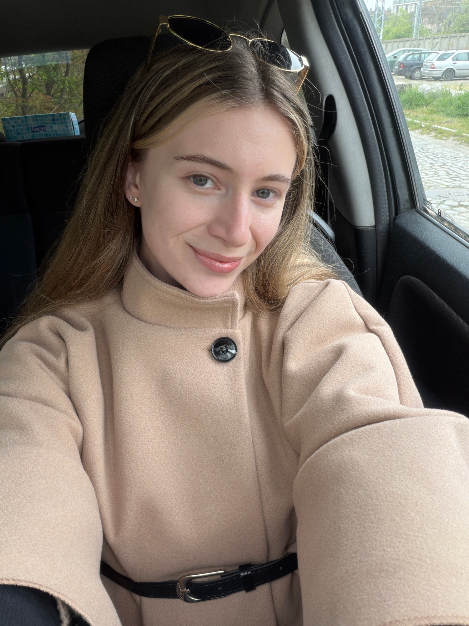 A young woman is taking a selfie in what appears to be the passenger seat of a car. She is wearing a light brown coat with a black belt. Sunglasses are perched on her head. The background visible thro…read more