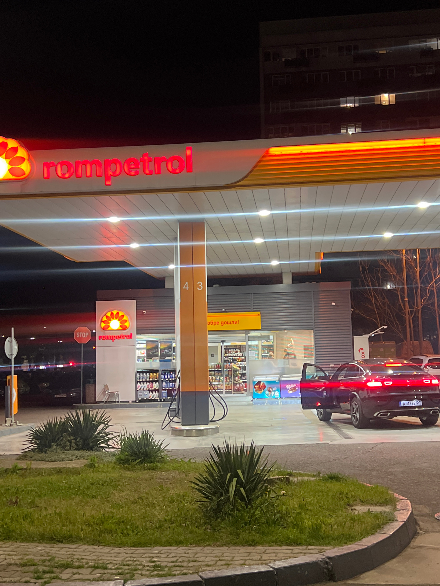 The image shows a Rompetrol gas station at night. The Rompetrol logo is prominently displayed in red neon. A dark-colored car with the license plate "A 4777 PT" is parked at one of the pumps with the…read more
