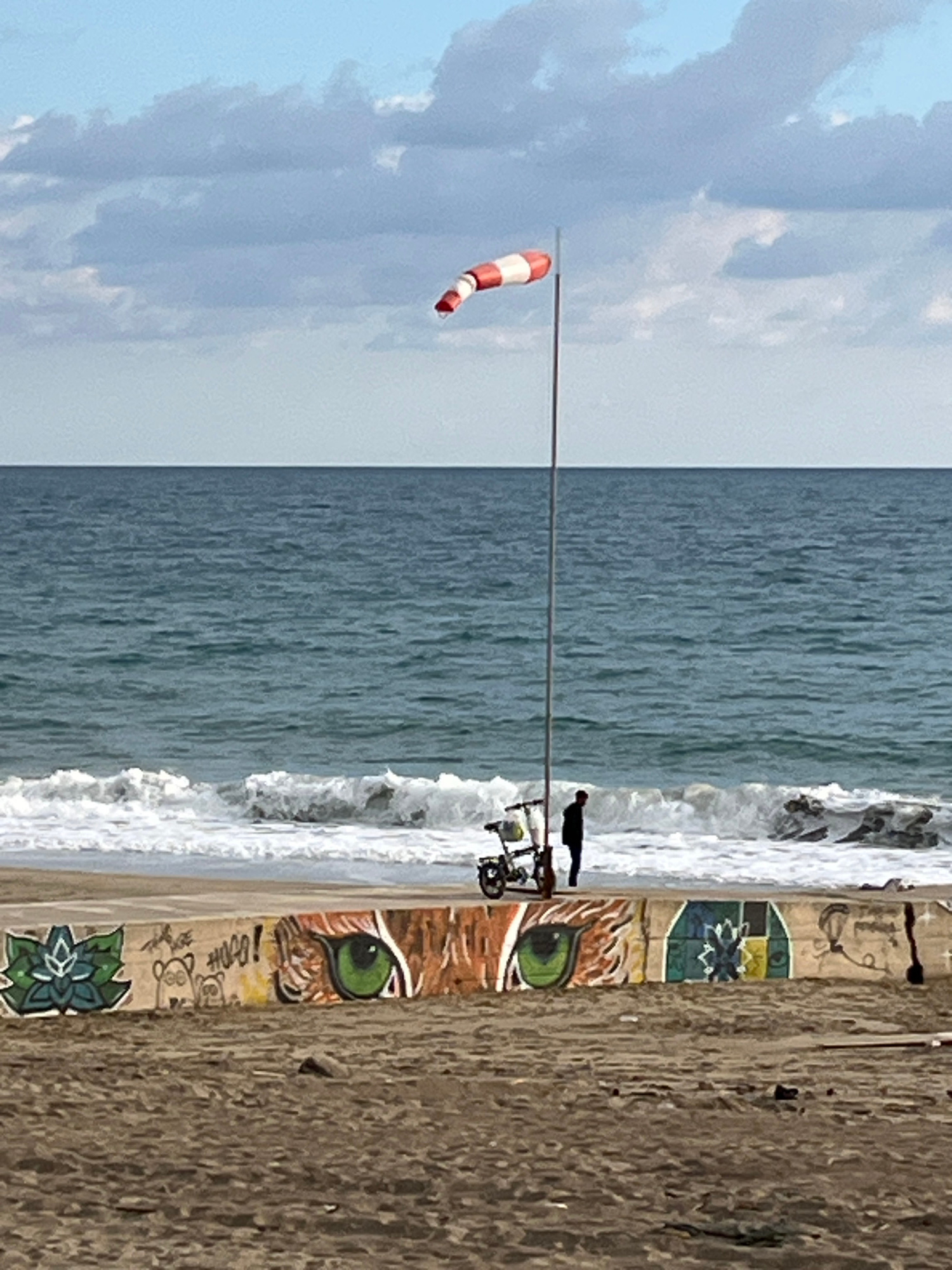 The scene captured at Alanya, Turkey, presents a seaside view featuring a windsock, ocean waves, a figure with a bicycle, and an art-adorned wall. The windsock, striped in red and white, indicates the…read more