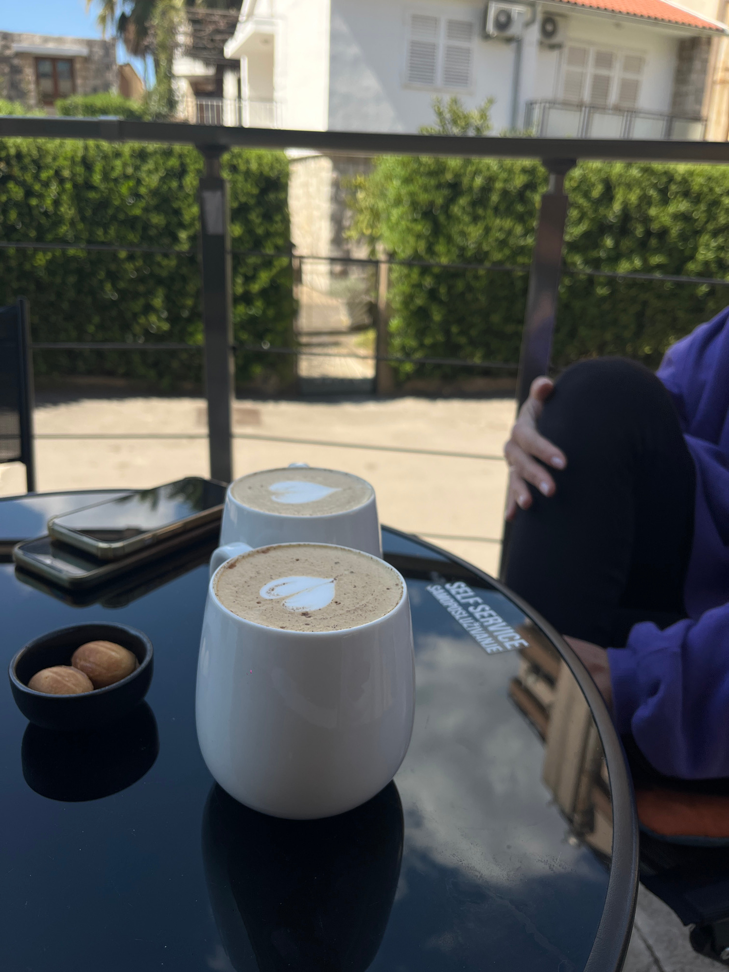 The scene is an outdoor setting, likely a café in Budva, Montenegro. Two white mugs containing lattes with latte art are placed on a black, reflective table, alongside a small black dish containing th…read more