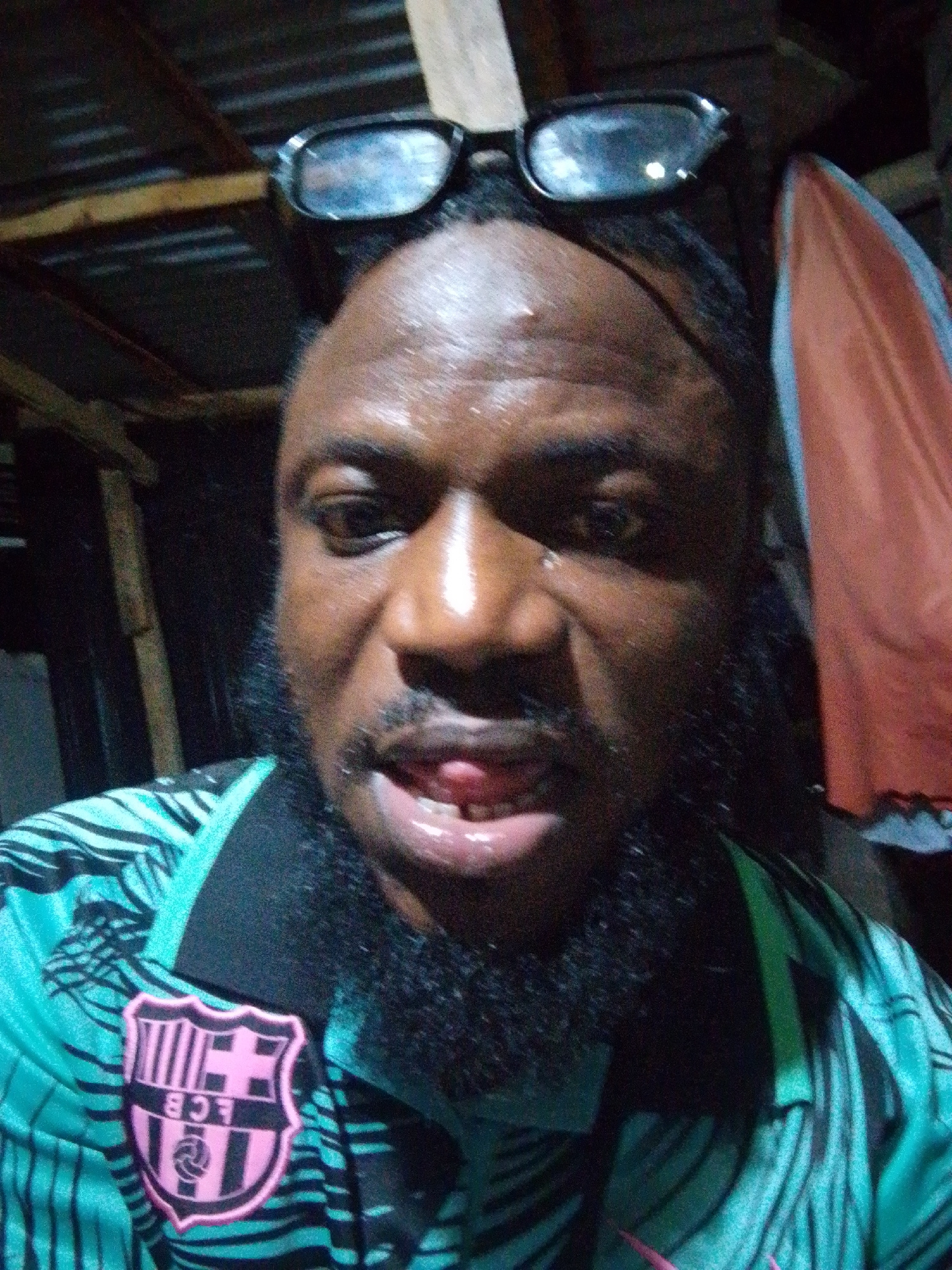A close-up selfie photograph shows a man with dark skin, a black beard, and black-framed glasses perched on his forehead. He is wearing a green and black striped soccer jersey with a pink Barcelona te…read more
