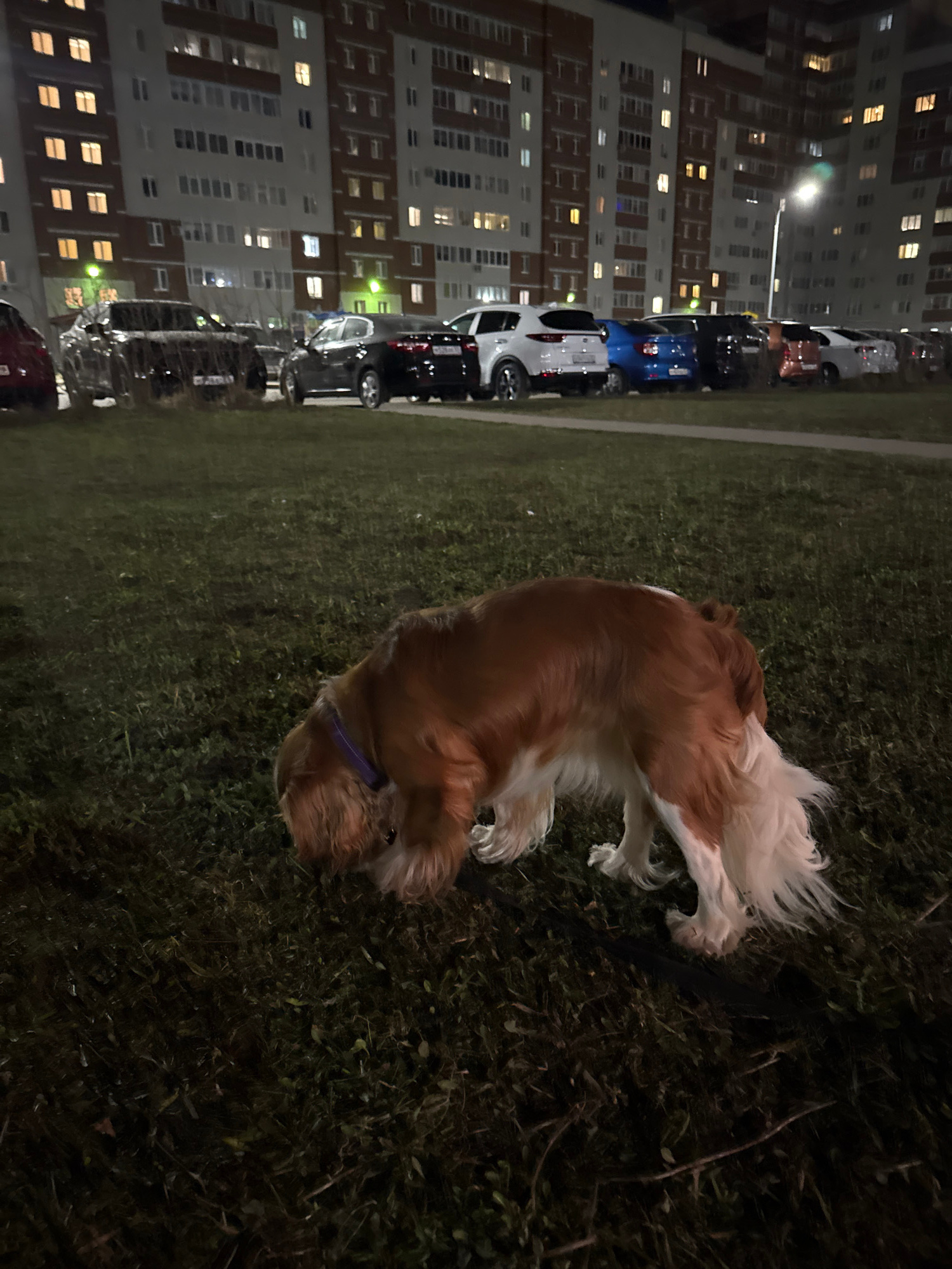 The photograph appears to be taken at night in an urban area. A dog, possibly a Cavalier King Charles Spaniel or similar breed, is lying on a patch of grass. The dog is brown and white, and a purple c…read more