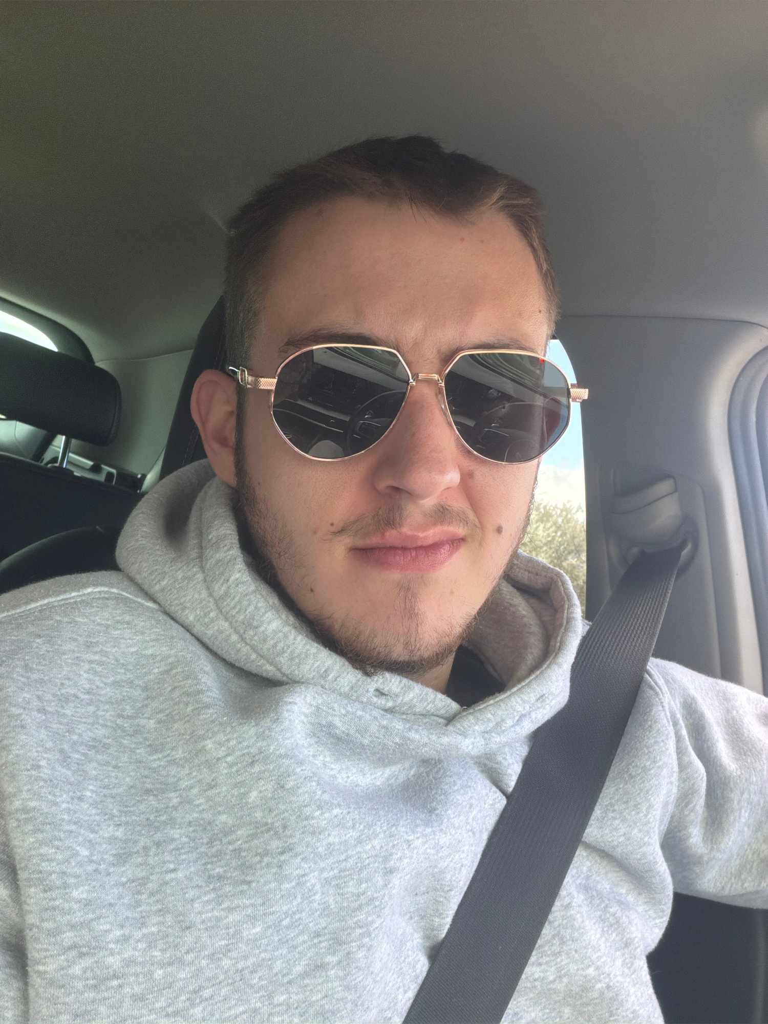 A young man with short brown hair and a light beard is wearing a grey hoodie and sunglasses, and is seated in a car, wearing a seatbelt. The car's interior is visible, with a grey interior and black s…read more