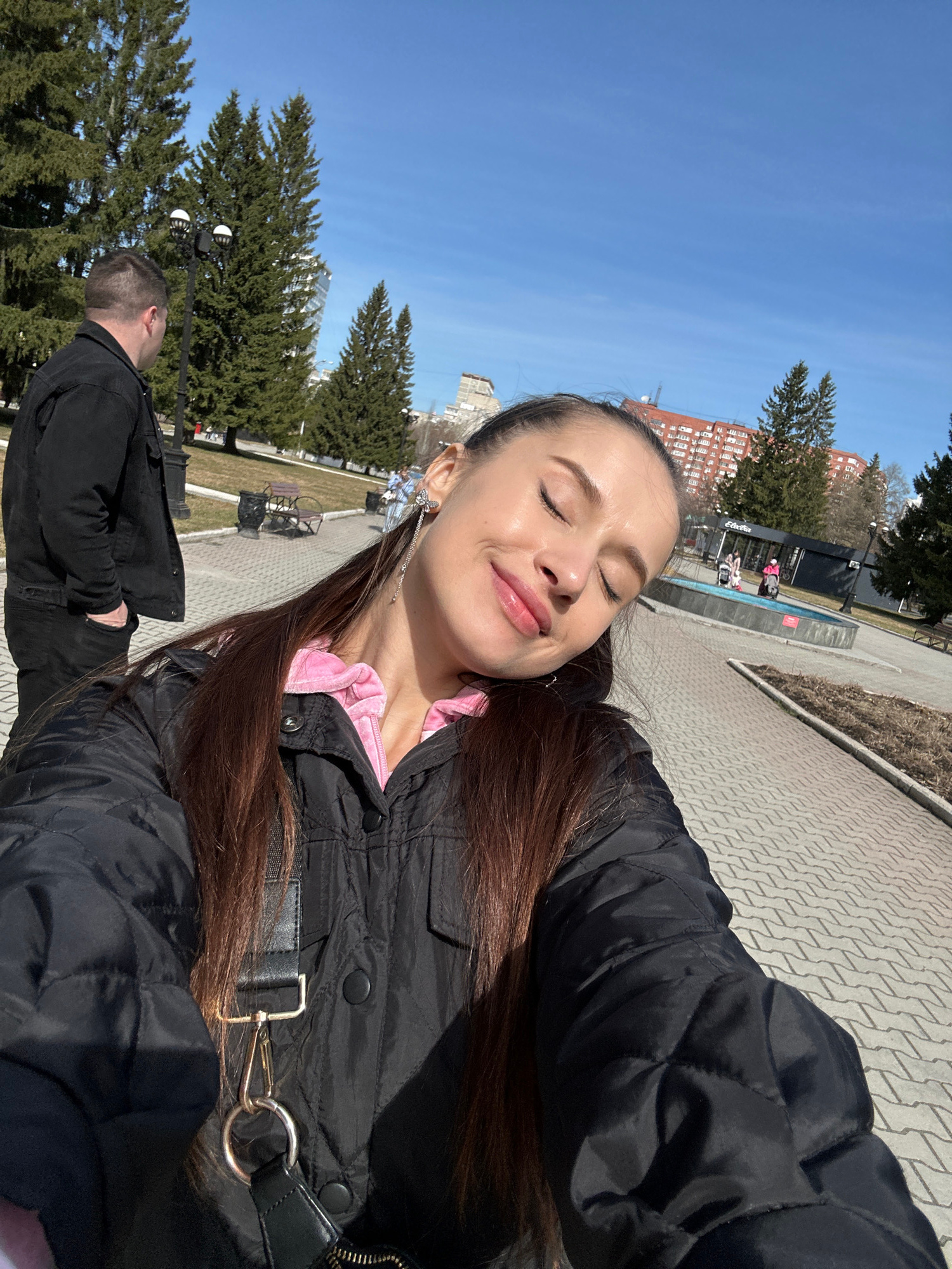 A selfie taken in Yekaterinburg, Russia shows a young woman outdoors on a sunny day, with her eyes closed, seemingly enjoying the sun. She is wearing a black jacket over a pink top and dangling earrin…read more