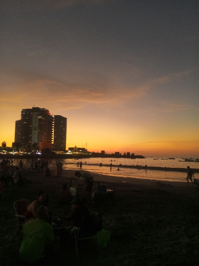 At dusk, a beach scene unfolds with silhouettes of people enjoying the sand and water. Buildings stand tall against the vibrant orange and yellow sky, reflecting in the gentle waves. Closer to the for…read more