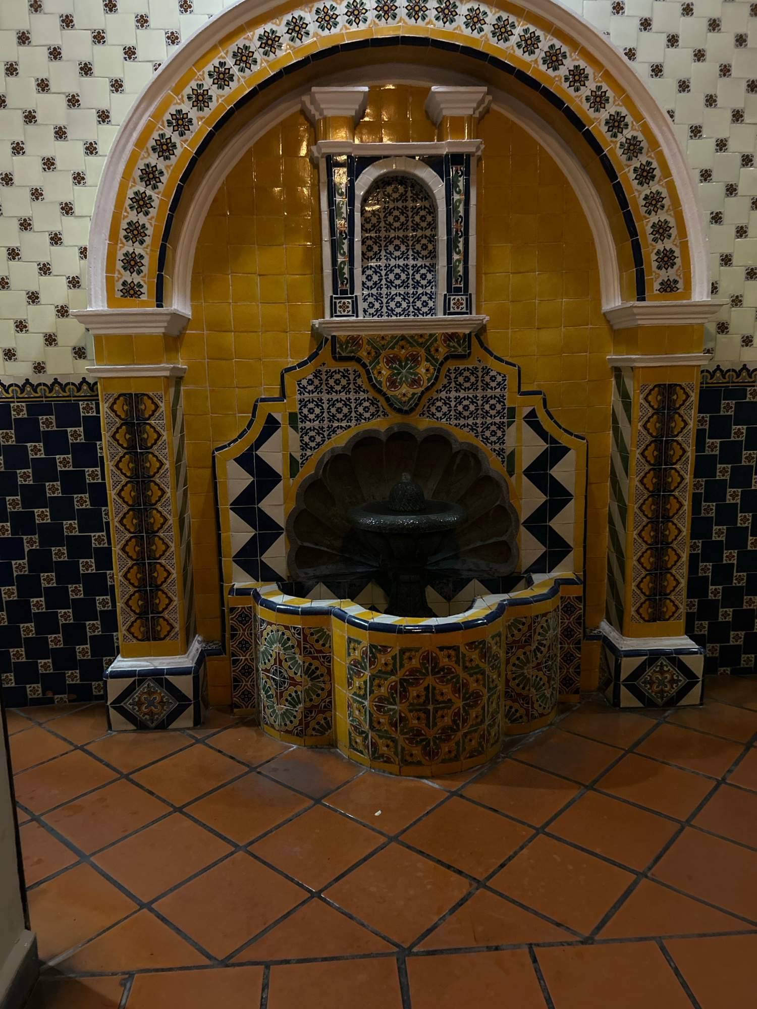 The image depicts a tiled water fountain in Santa Ana Yancuitlalpan (Chilhuacán), Mexico. The fountain is set against a wall covered in white and floral patterned tiles. A large, arched structure surr…read more