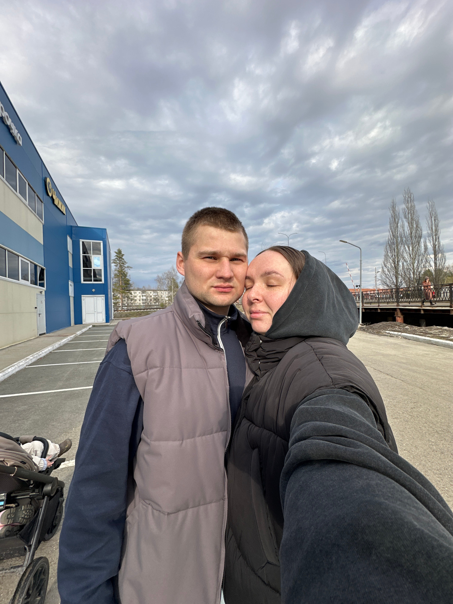 This media file is a portrait-oriented selfie featuring a man and a woman standing outdoors. The man, with short dark hair and light stubble, is positioned in the foreground, looking directly at the c…read more