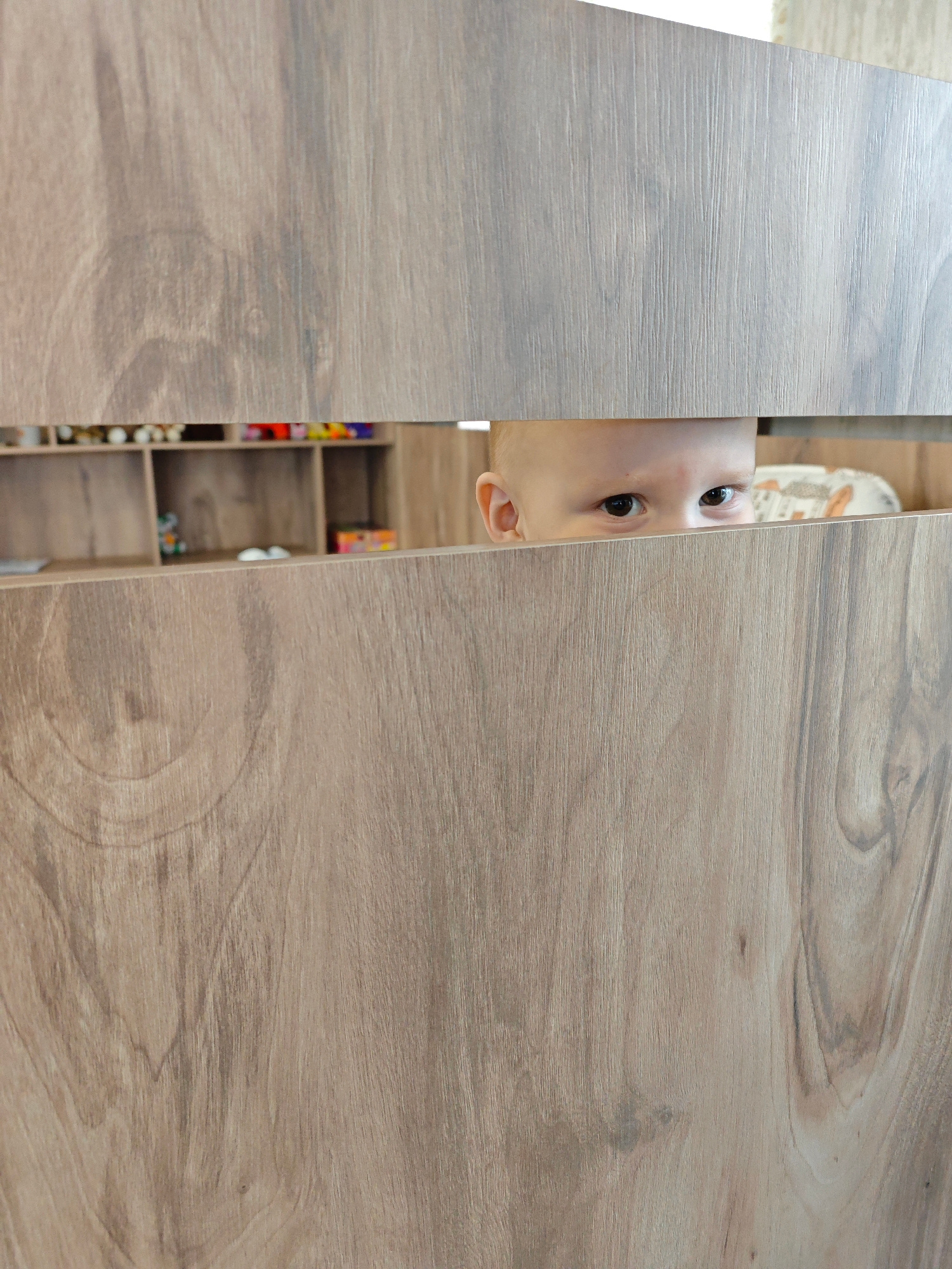 The image shows a close-up, eye-level perspective of a baby or toddler peeking out from behind a wooden barrier, presumably a crib or playpen, in an indoor setting in Chaikovsky, Russia. The foregroun…read more