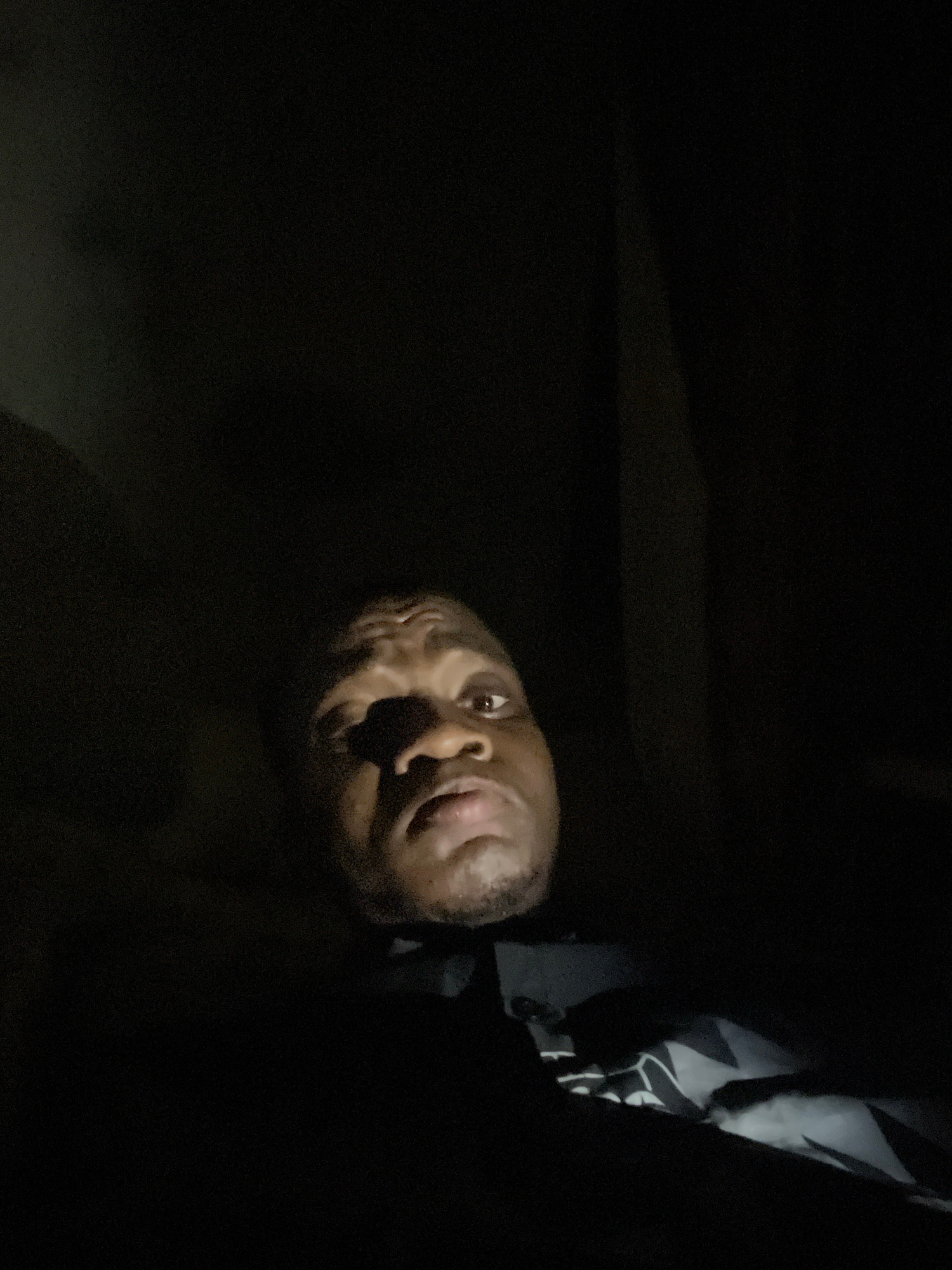 A photograph taken in low light depicts a person with dark skin and short hair, facing the camera with their mouth open, and appearing to be upside down in the frame. The background is dark, obscuring…read more