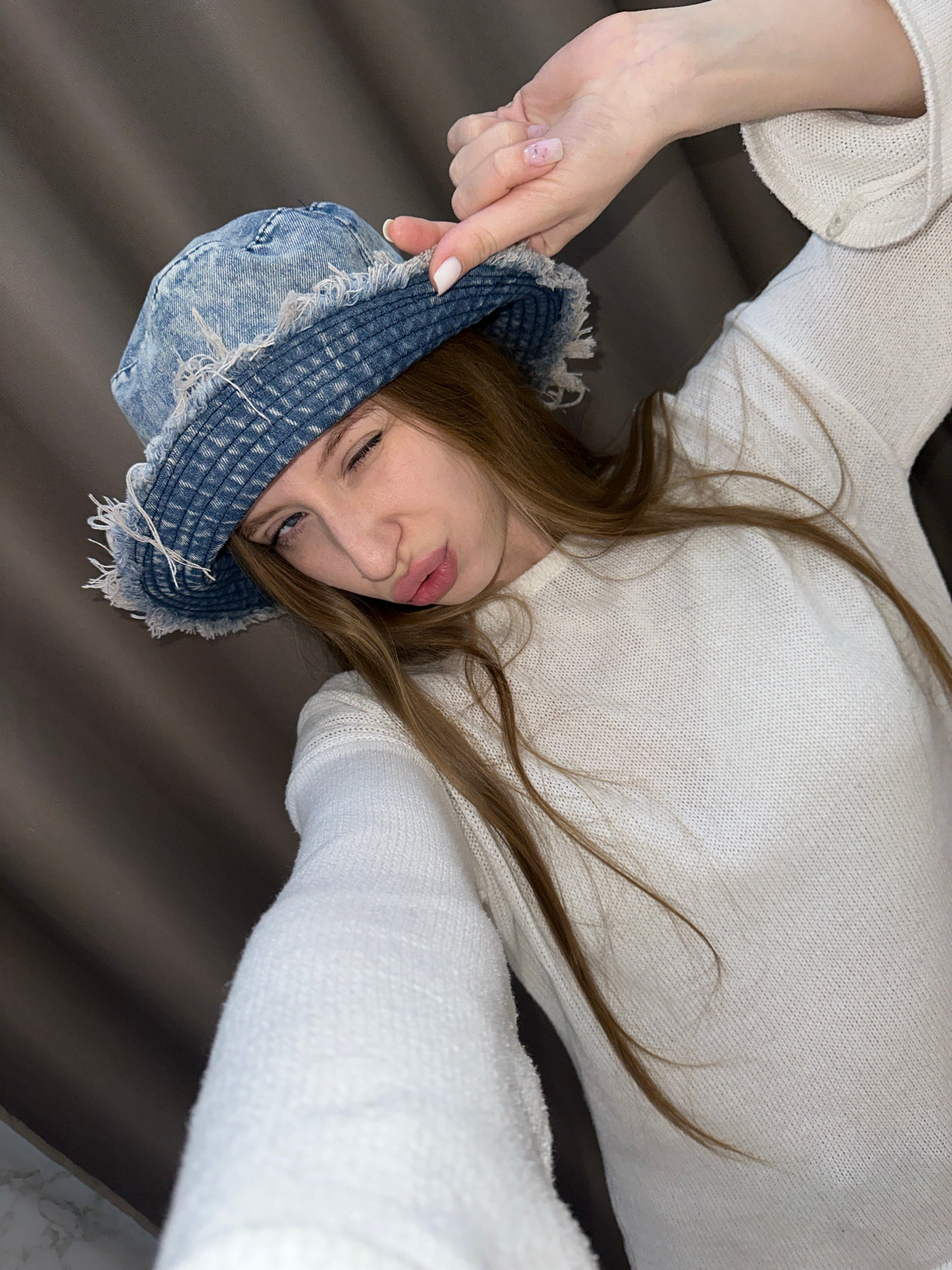 A young woman lies on a dark gray surface, likely a couch or bed, indoors. She is wearing a white knit top and holding a blue denim bucket hat with a frayed brim over her eyes. Her light brown hair is…read more