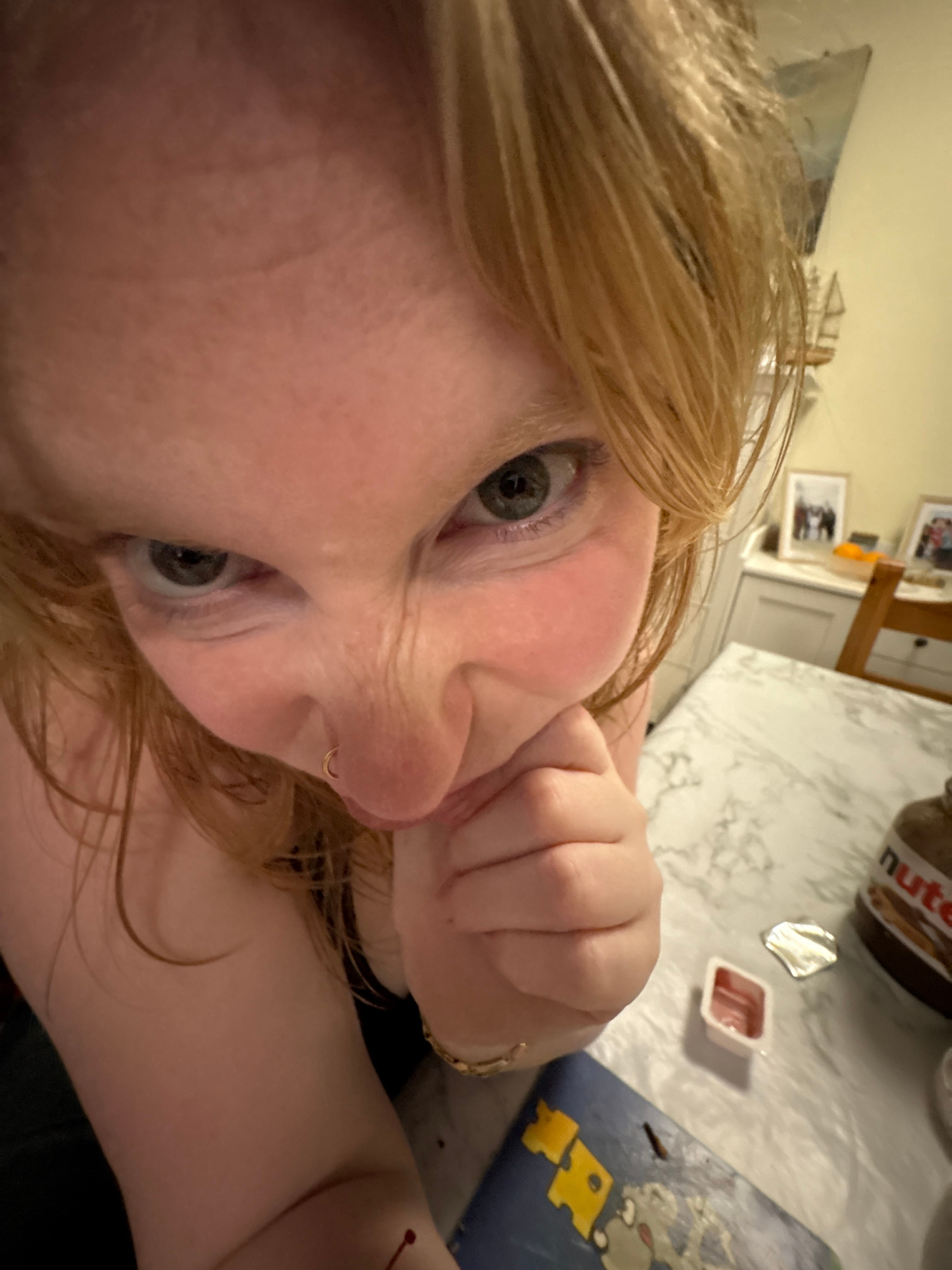 A selfie of a light-skinned person with light red hair and grey eyes. The person is holding their fist to their face, with their thumb near their mouth. They wear a small gold nose ring and a gold bra…read more