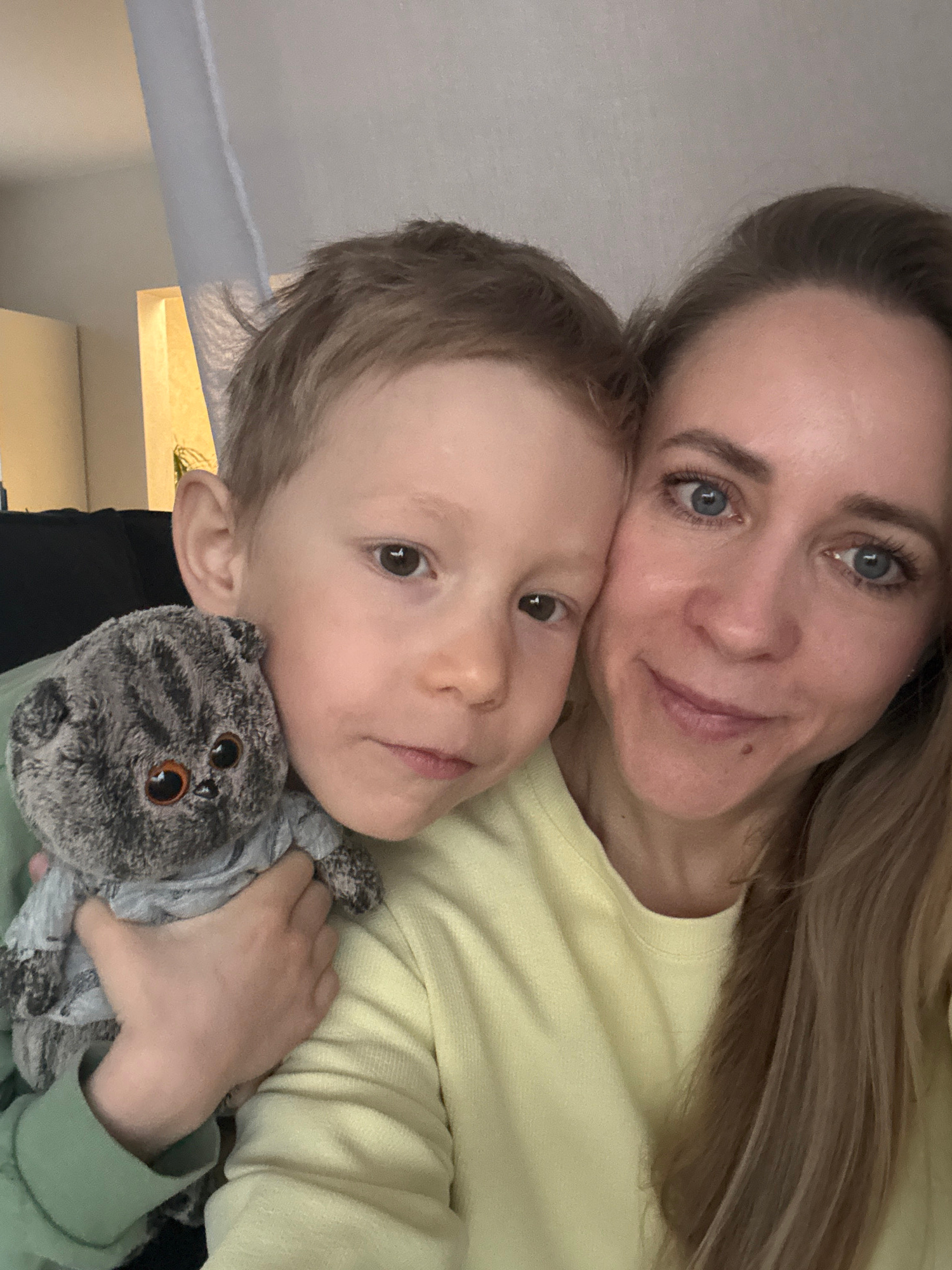 A selfie-style photograph shows a woman and a young child. The woman has fair skin, blue eyes, and long blonde hair. She is wearing a light yellow shirt. The child has fair skin, light brown hair, and…read more