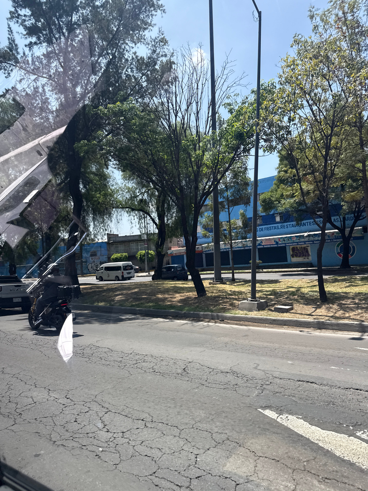 The image is taken from inside a vehicle in Mexico City, Mexico. It shows a street with cracked asphalt. The view is partially obscured by the vehicle's interior. On the side of the street, there are…read more
