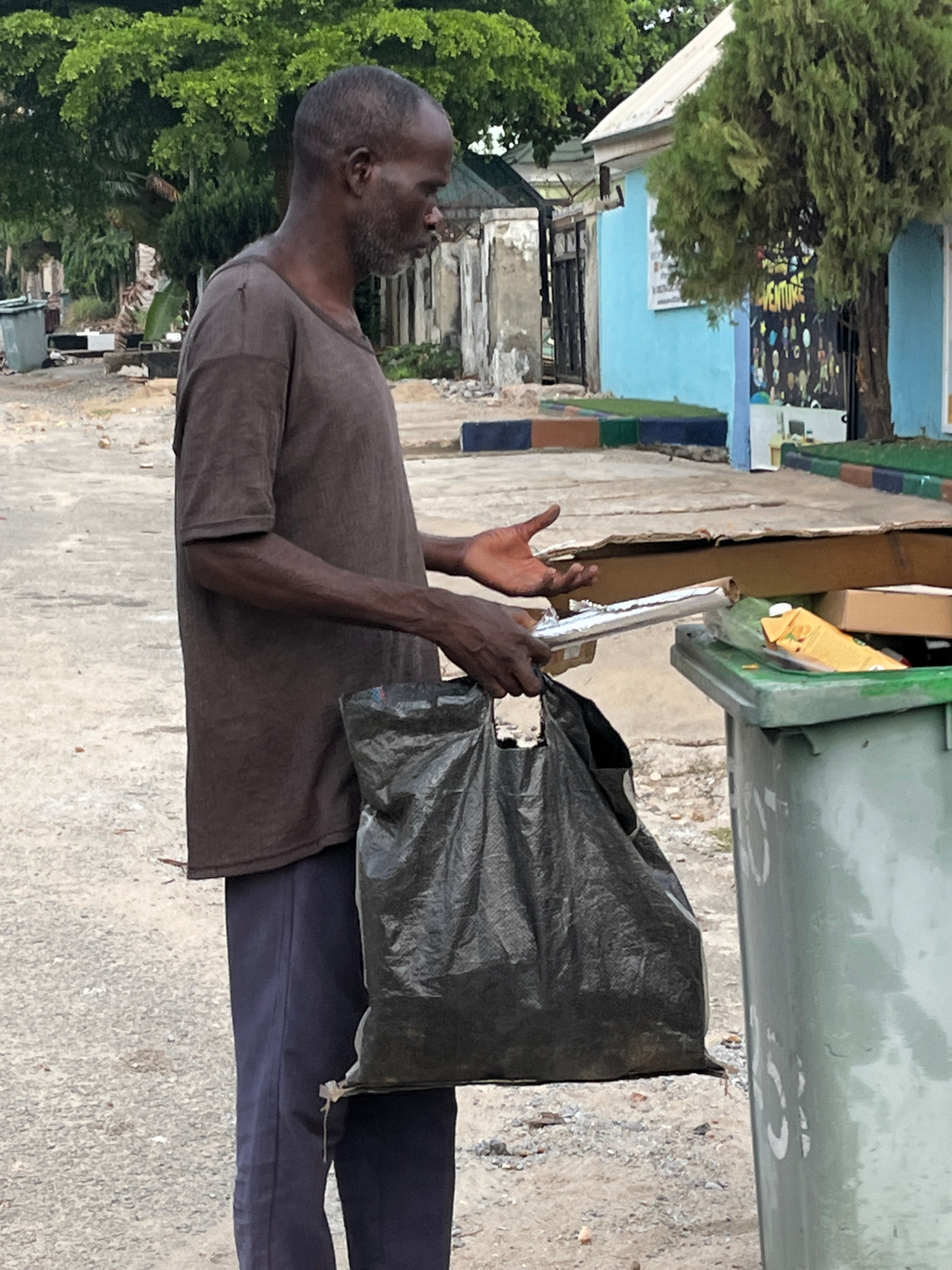 A man in a brown t-shirt and dark pants is seen putting a long, silver object into a trash bag that he is holding open. The trash bag is next to a green trash can, and there are boxes inside. He is ou…read more