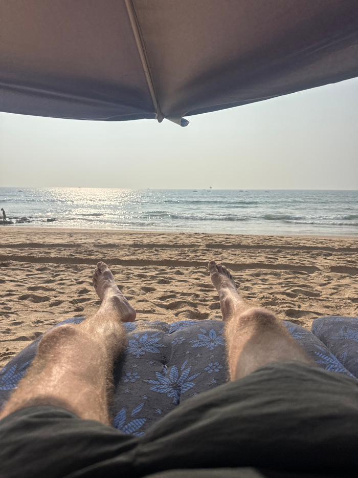 The image presents a first-person perspective from beneath a dark sun umbrella on a beach in Sinquerim, India. In the foreground, a person's bare, hairy legs extend forward, resting on a dark gray cus…read more