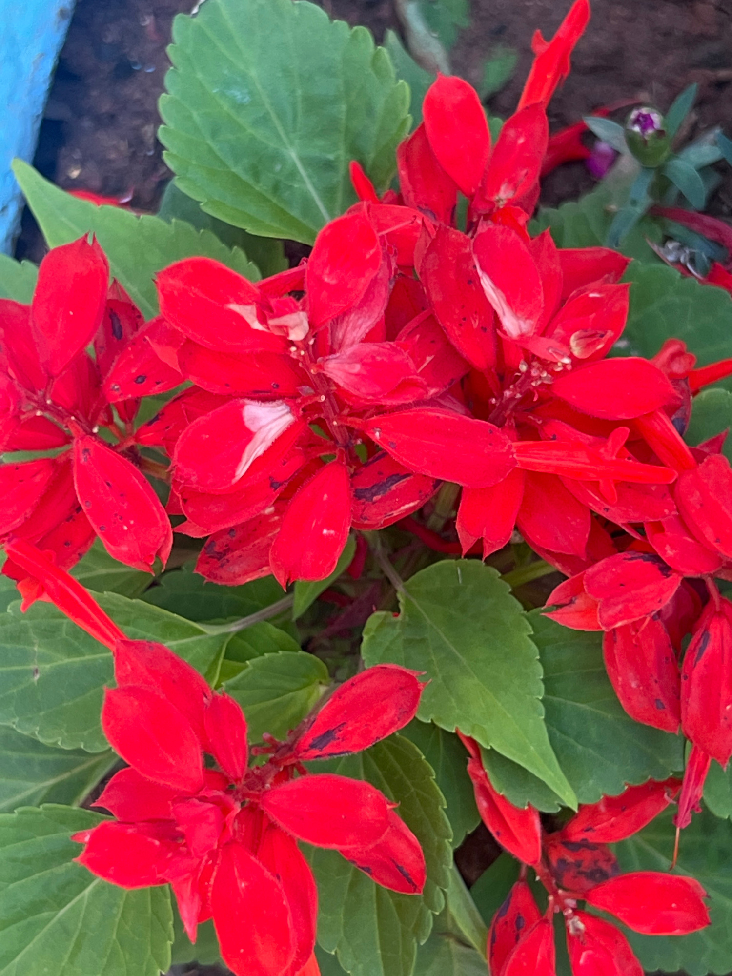 The image shows a close-up view of red Salvia splendens flowers surrounded by green leaves. Some petals have small dark spots and white blemishes. A small purple flower bud is visible in the backgroun…read more