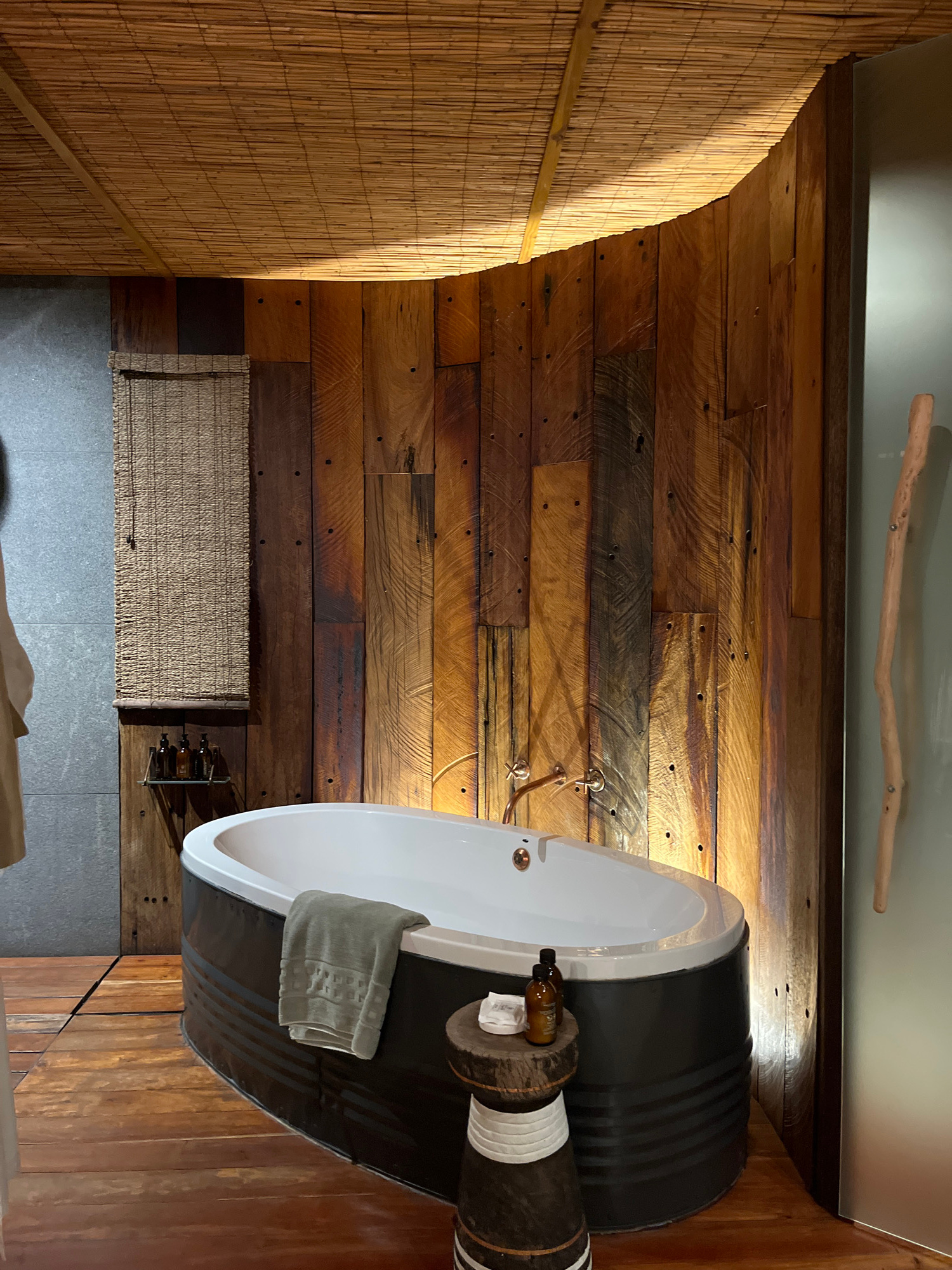 The image depicts a bathroom interior, possibly in Livingstone, Zambia, given the use of natural materials in a rustic design. The room features walls constructed from horizontal wooden planks, creati…read more