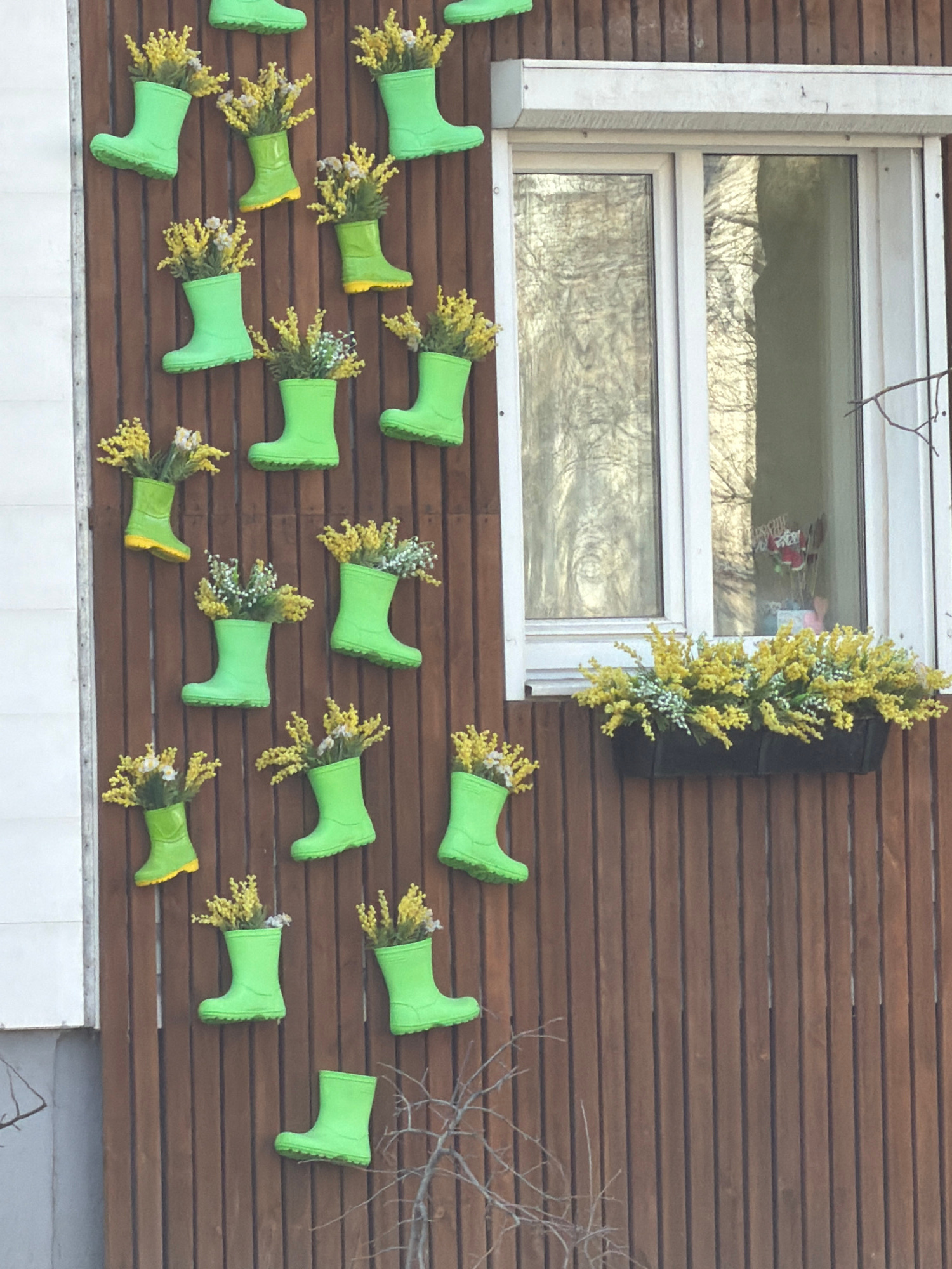 This image captures an outdoor decorative wall in Chaikovsky, Russia. The central feature is a brown, horizontally-slatted wooden wall. In the upper left, a white-framed window with two panes reflects…read more