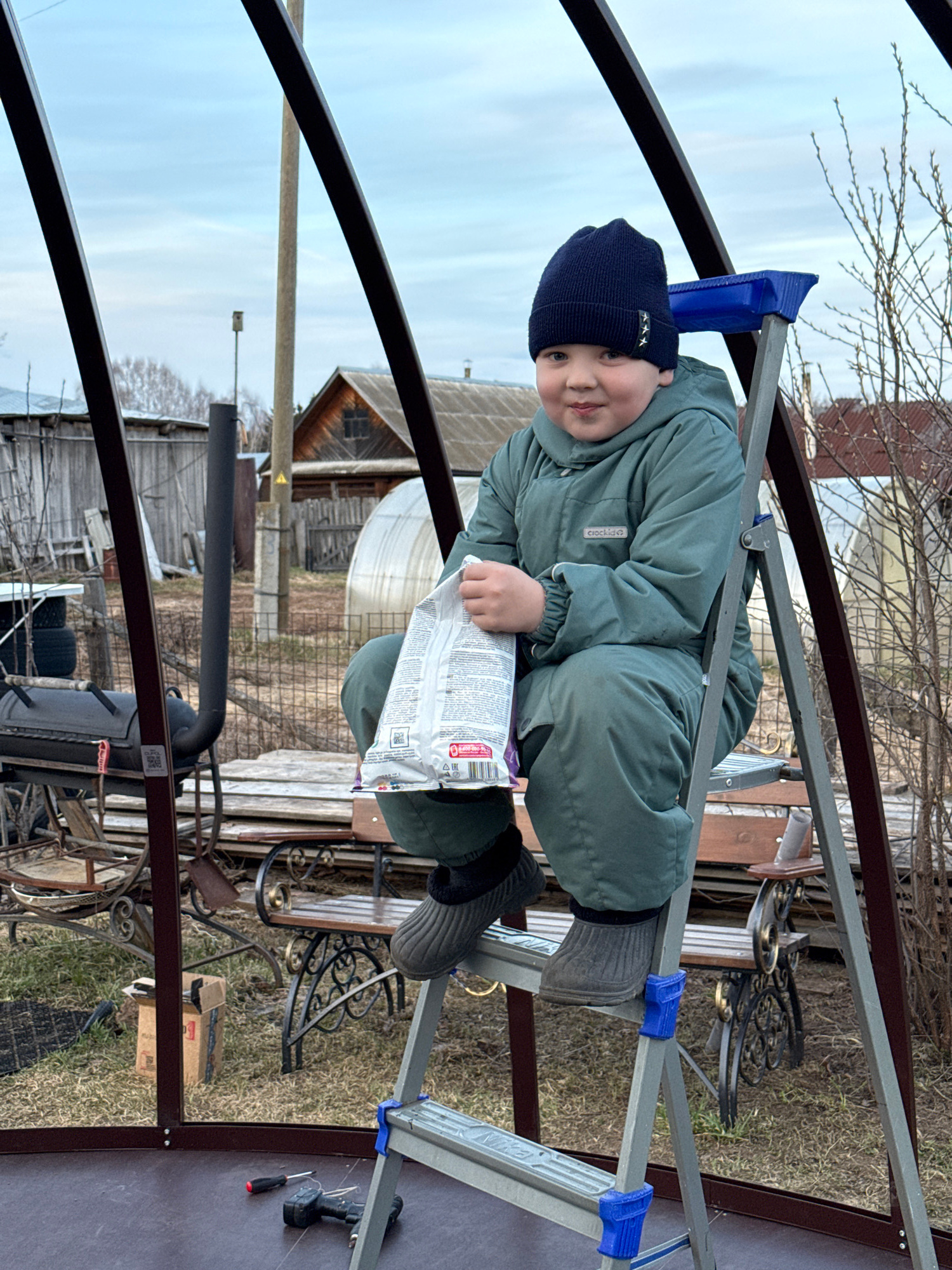 A boy wearing a navy knit hat and a sage green snowsuit squats on a silver aluminum ladder with blue plastic caps on its ends. He holds a white package with printed text. The ladder is positioned insi…read more