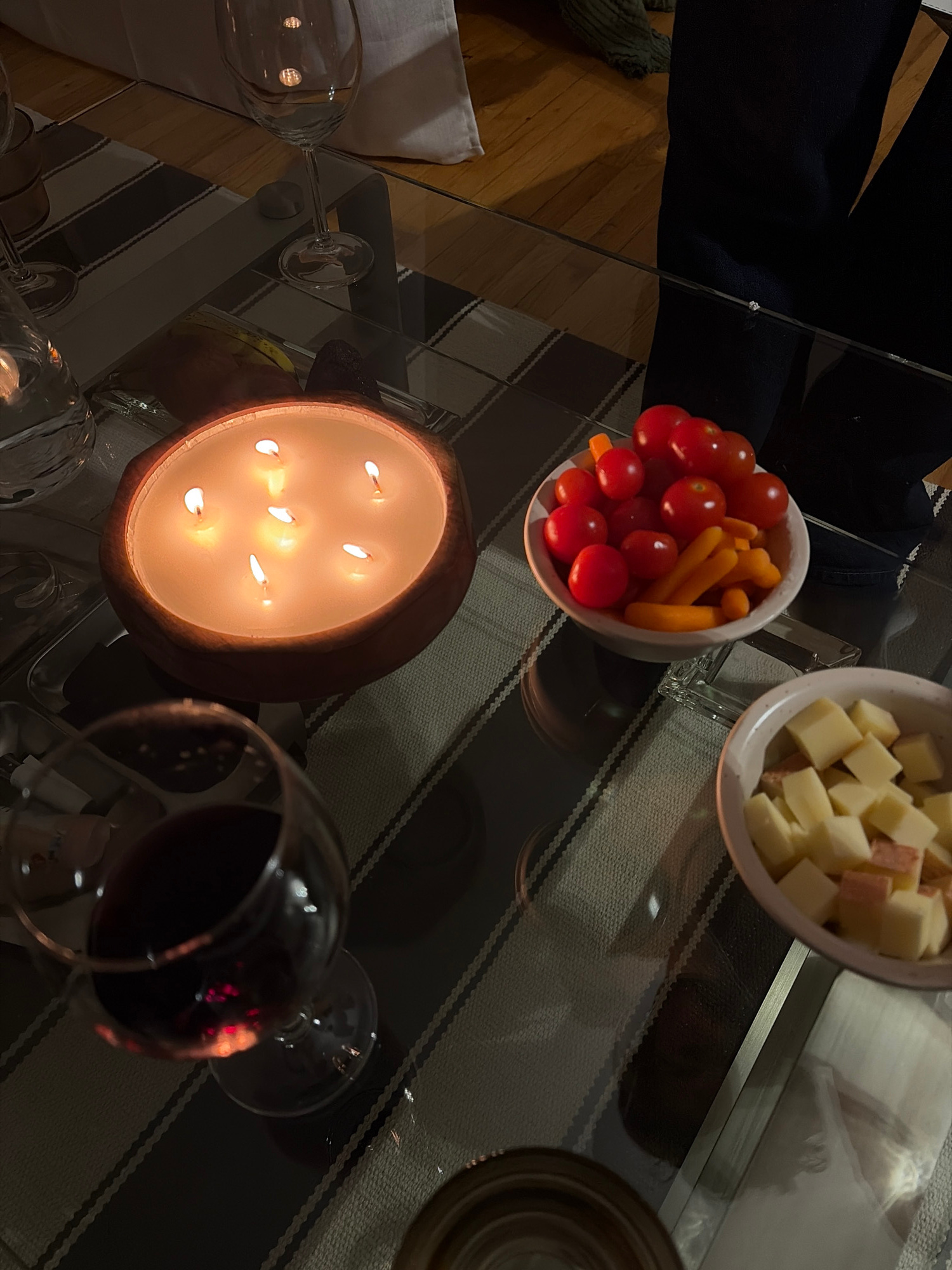 The image shows a high-angle view of a glass-topped table with a striped runner. On the table are bowls of cheese cubes and cherry tomatoes with carrot sticks. A large, lit candle in a wooden containe…read more