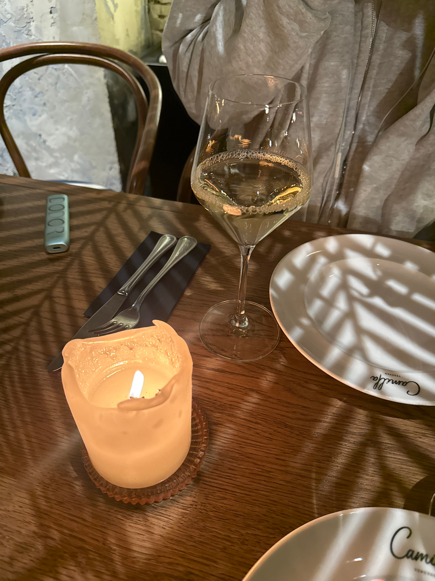 The image shows a table setting at Camilla Yerevan, located in Yerevan, Armenia. The table is made of dark-stained wood and has a white plate with the restaurant's name on it. A wine glass filled with…read more