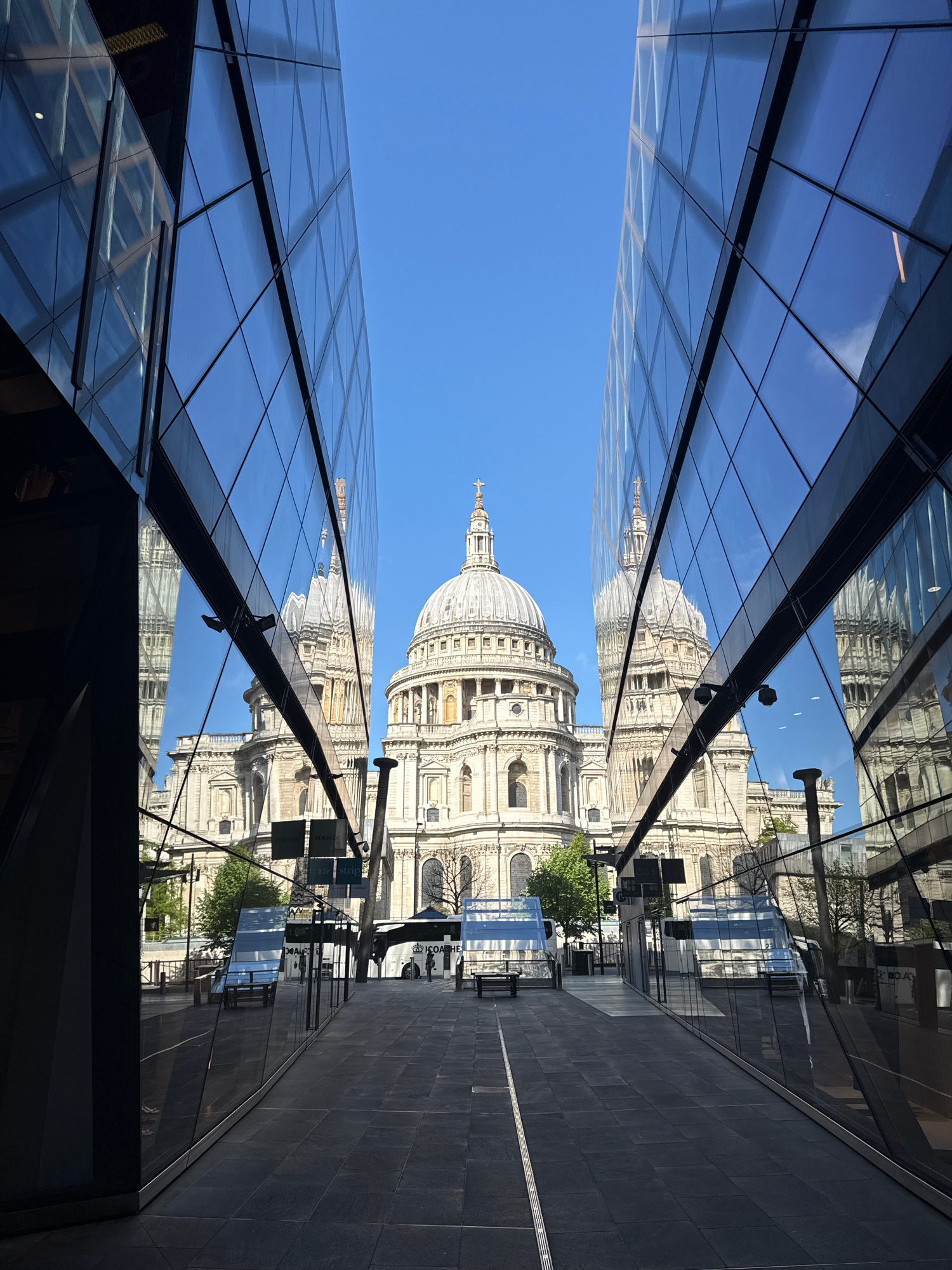 The image captures St. Paul's Cathedral in London, United Kingdom, framed by modern glass buildings. The cathedral dominates the view, seen between the converging lines of the adjacent buildings. The…read more