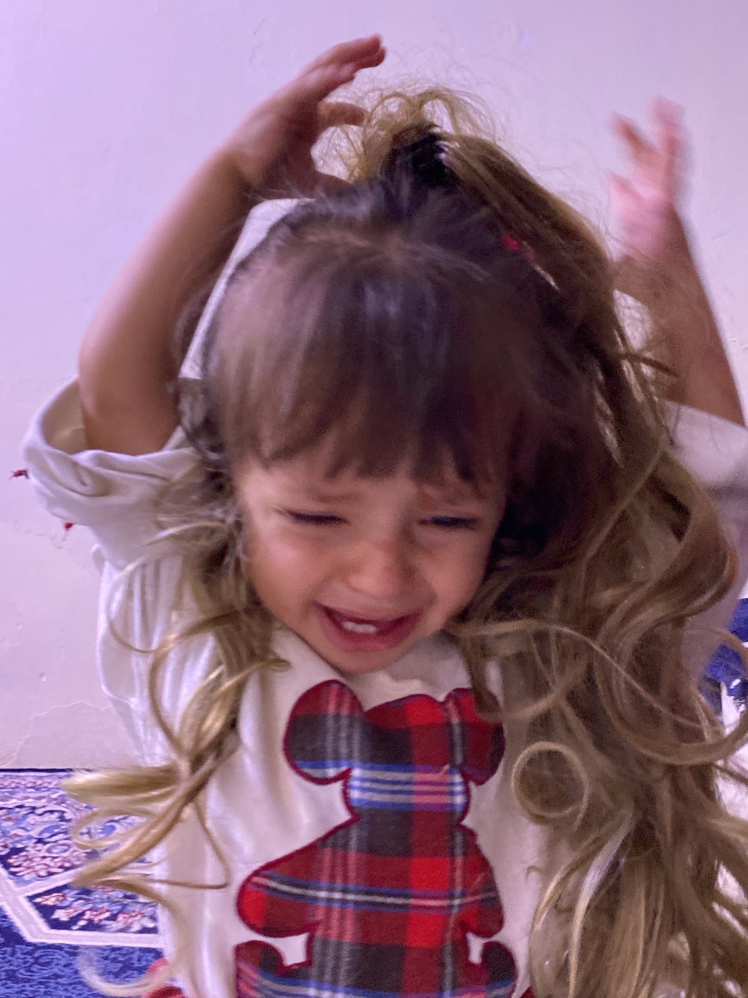 A young child with brown hair, styled with bangs and a ponytail, is pictured indoors. The child appears to be in motion with both hands raised near their head. They are wearing a long-sleeved, light-c…read more