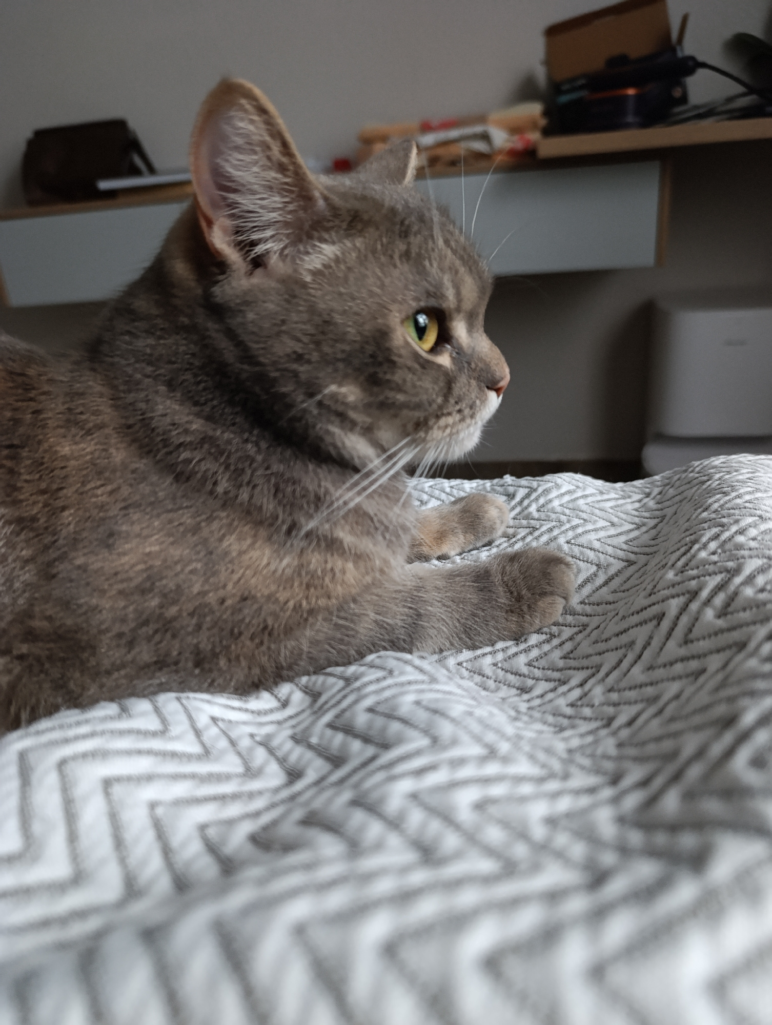 A gray tabby cat is lying on a gray and white patterned blanket. The cat is facing right and looking off into the distance. Its right ear is visible, as is its yellow-green eye. The cat's paw is exten…read more