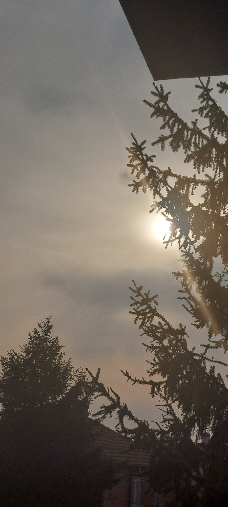 The image depicts a view upwards through pine tree branches towards a hazy sky, likely affected by smoke or fog. The sun is visible through the branches, creating a bright glare. A portion of a buildi…read more