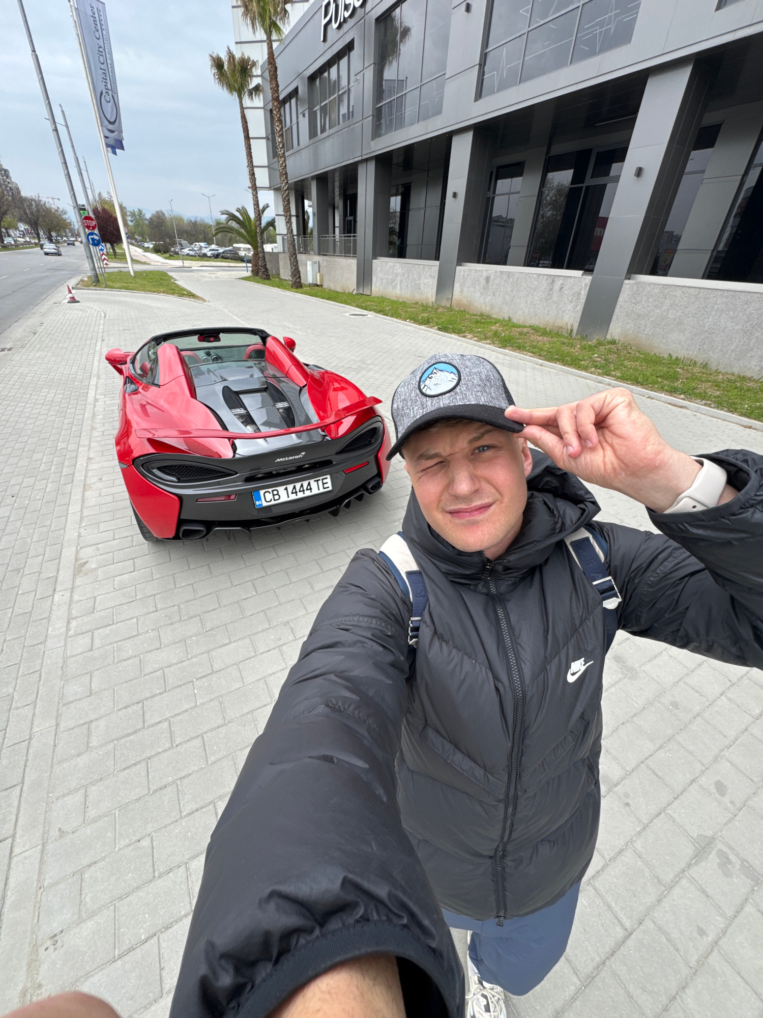 A man is taking a selfie next to a red McLaren sports car. He is wearing a black puffer jacket, a gray hat with a logo, and a white wristwatch. The car has a Bulgarian license plate that reads "CB 144…read more
