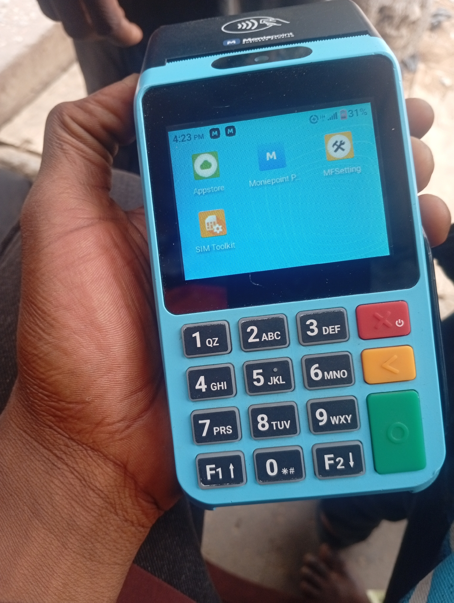 A dark-skinned hand is holding a blue Moniepoint point-of-sale device. The device screen displays icons for "Appstore," "Moniepoint P," "MFSetting," and "SIM Toolkit." The time on the device is 4:23 P…read more