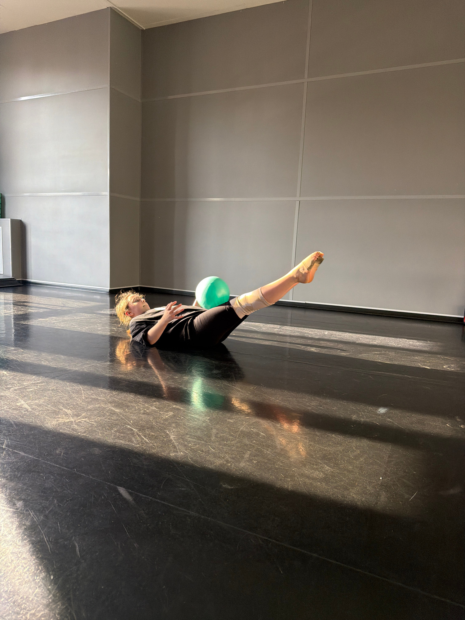 A woman is lying on her back on a dark floor in a room with a gray wall. She has her knees bent and a green balloon is positioned between her legs. Her left leg is raised up. She is wearing black clot…read more